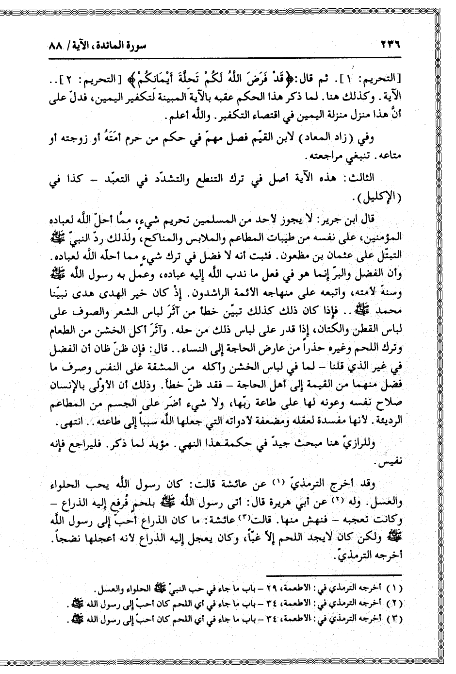 قال ابن جرير: لا يجوز لأحد من المسلمين تحريم شيء، ممّا أحلّ الله لعباده المؤمنين، على نفسه من طيبات المطاعم والملابس والمناكح، ولذلك ردّ النبيّ صلى الله عليه وسلم التبتّل على عثمان بن مظعون. فثبت أنه لا فضل في ترك شيء مما أحلّه الله لعباده.