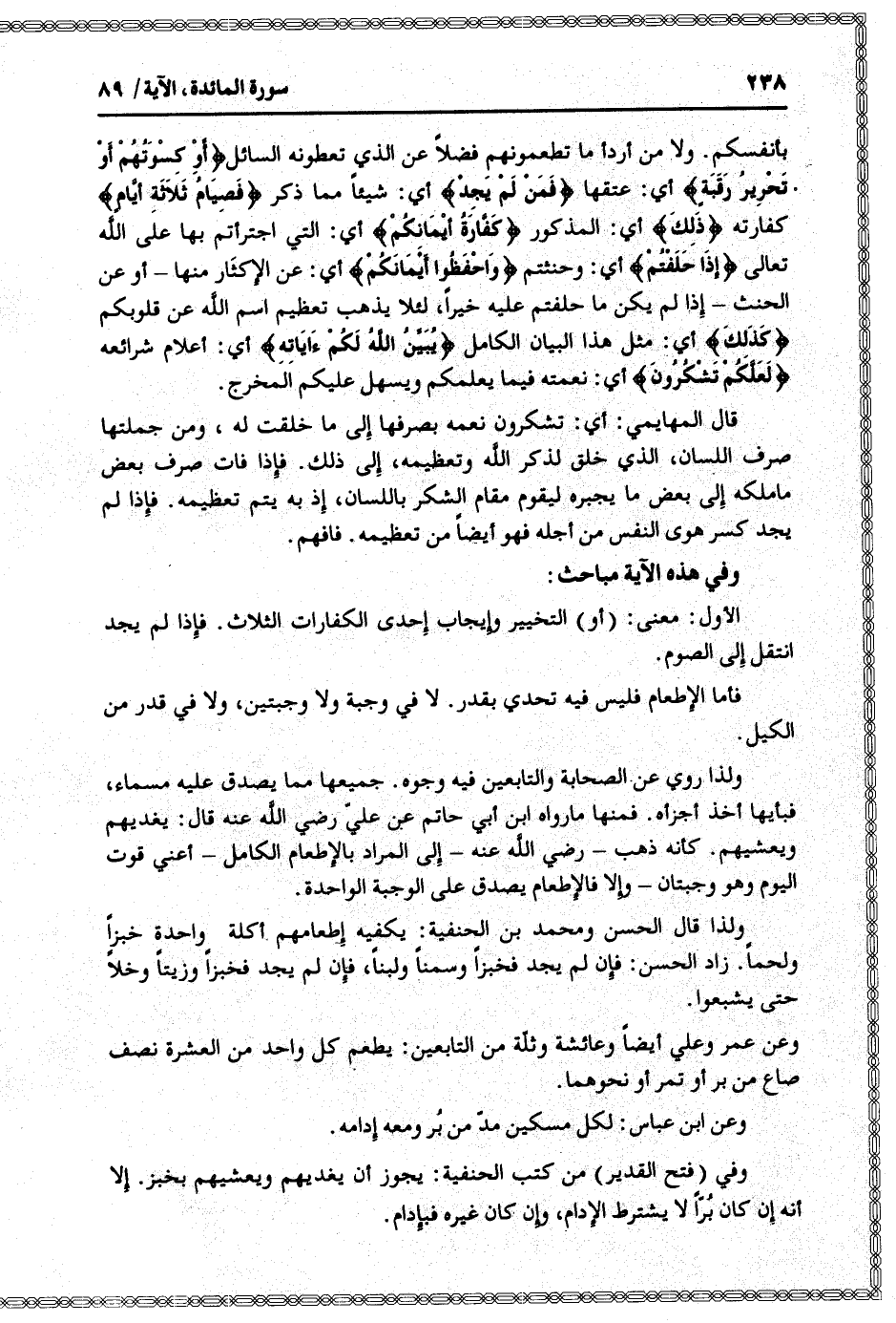 بأنفسكم. ولا من أردأ ما تطعمونهم فضلا عن الذي تعطونه السائل أَوْ كِسْوَتُهُمْ أَوْ تَحْرِيرُ رَقَبَةٍ أي: عتقها فَمَنْ لَمْ يَجِدْ أي: شيئا مما ذكر فَصِيامُ ثَلاثَةِ أَيَّامٍ كفارته ذلِكَ أي: المذكور كَفَّارَةُ أَيْمانِكُمْ أي: التي اجترأتم بها على الله تعالى إِذا حَلَفْتُمْ أي: وحنثتم وَاحْفَظُوا أَيْمانَكُمْ أي: عن الإكثار منها- أو عن الحنث- إذا لم يكن ما حلفتم عليه خيرا، لئلا يذهب تعظيم اسم الله عن قلوبكم كَذلِكَ أي: مثل هذا البيان الكامل يُبَيِّنُ اللَّهُ لَكُمْ آياتِهِ أي: أعلام شرائعه لَعَلَّكُمْ تَشْكُرُونَ أي: نعمته فيما يعلمكم ويسهل عليكم المخرج.