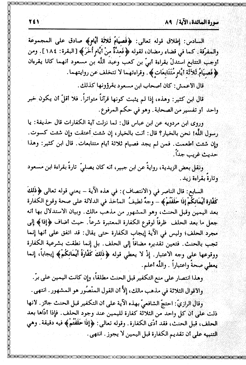 السابع: قال الناصر في (الانتصاف) : في هذه الآية- يعني قوله تعالى ذلِكَ كَفَّارَةُ أَيْمانِكُمْ إِذا حَلَفْتُمْ- وجه لطيف المأخذ في الدلالة على صحة وقوع الكفارة بعد اليمين وقبل الحنث، وهو المشهور من مذهب مالك. وبيان الاستدلال بها أنه جعل ما بعد الحلف ظرفا لوقوع الكفارة المعتبرة شرعا. حيث أضاف إِذا إلى مجرد الحلف وليس في الآية إيجاب الكفارة حتى يقال: قد اتفق على أنها إنما تجب بالحنث. فتعين تقديره مضافا إلى الحلف. بل إنما نطقت بشرعية الكفارة ووقوعها على وجه الاعتبار. إذ لا يعطي قوله ذلِكَ كَفَّارَةُ أَيْمانِكُمْ إيجابا، إنما يعطي صحة واعتبارا. والله أعلم.