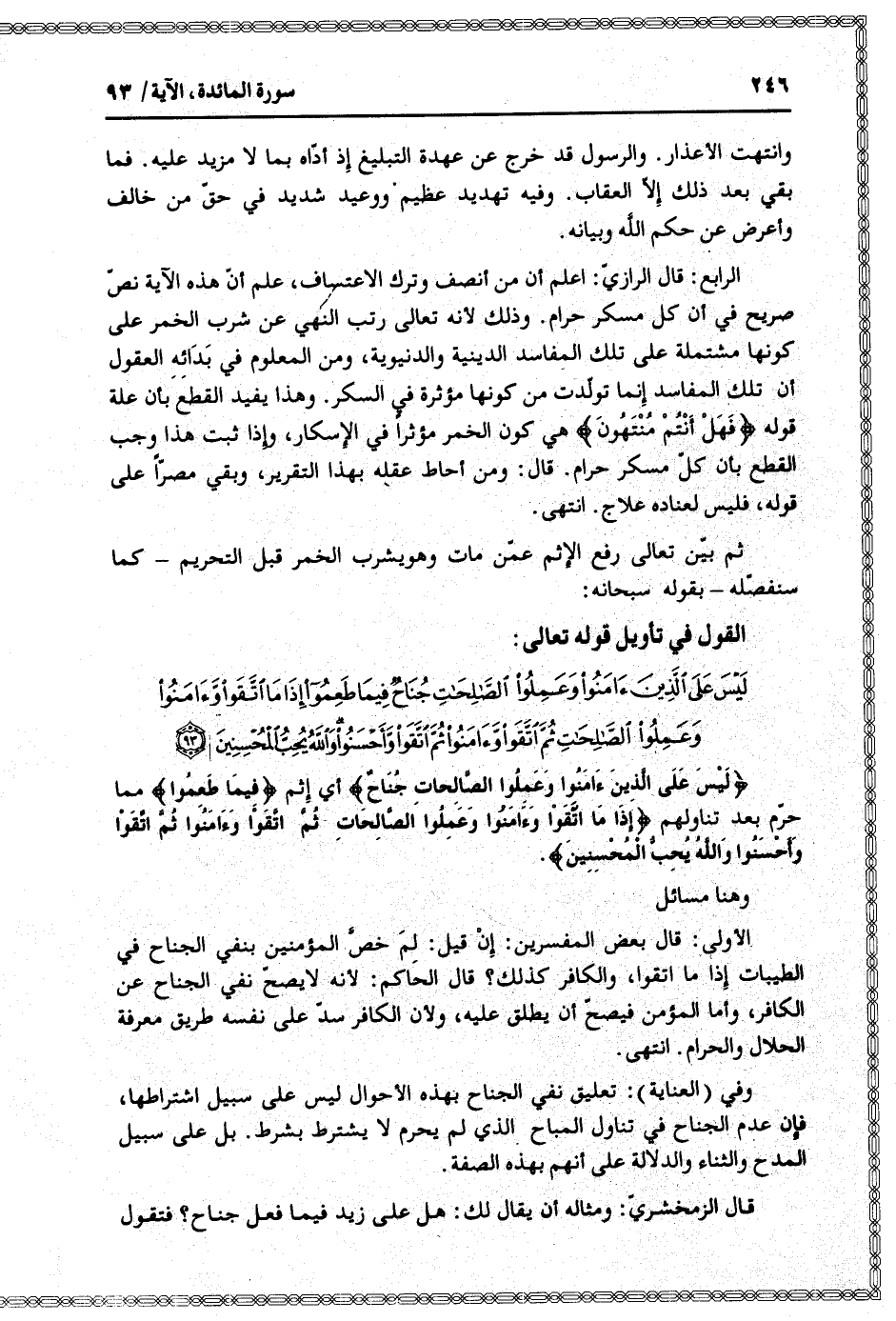 لَيْسَ عَلَى الَّذِينَ آمَنُوا وَعَمِلُوا الصَّالِحاتِ جُناحٌ فِيما طَعِمُوا إِذا مَا اتَّقَوْا وَآمَنُوا وَعَمِلُوا الصَّالِحاتِ ثُمَّ اتَّقَوْا وَآمَنُوا ثُمَّ اتَّقَوْا وَأَحْسَنُوا وَاللَّهُ يُحِبُّ الْمُحْسِنِينَ (93)