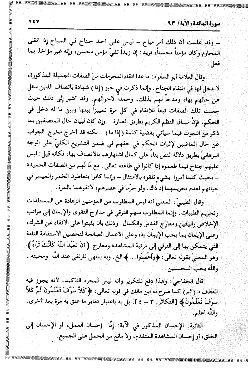وقال العلامة أبو السعود: ما عدا اتقاء المحرمات من الصفات الجميلة المذكورة، لا دخل لها في انتفاء الجناح. وإنما ذكرت في حيز (إذا) شهادة باتصاف الذين سئل عن حالهم بها، ومدحا لهم بذلك، وحمدا لأحوالهم. وقد أشير إلى ذلك حيث جعلت تلك الصفات تبعا للاتقاء في كل مرة تمييزا بينها وبين ما له دخل في الحكم، فإنّ مساق النظم الكريم بطريق العبارة- وإن كان لبيان حال المتصفين بما ذكر من النعوت فيما سيأتي بقضية كلمة (إذا ما) - لكنه قد أخرج مخرج الجواب عن حال الماضين لإثبات الحكم في حقهم في ضمن التشريع الكليّ على الوجه البرهانيّ بطريق دلالة النص بناء على كمال اشتهارهم بالاتصاف بها، فكأنه قيل: ليس عليهم جناح فيما طعموه إذا كانوا في طاعته تعالى. مع ما لهم من الصفات الحميدة- بحيث كلما أمروا بشيء تلقوه بالامتثال- وإنما كانوا يتعاطون الخمر والميسر في حياتهم لعدم تحريمهما إذ ذاك. ولو حرّما في عصرهم، لاتقوهما بالمرة.
