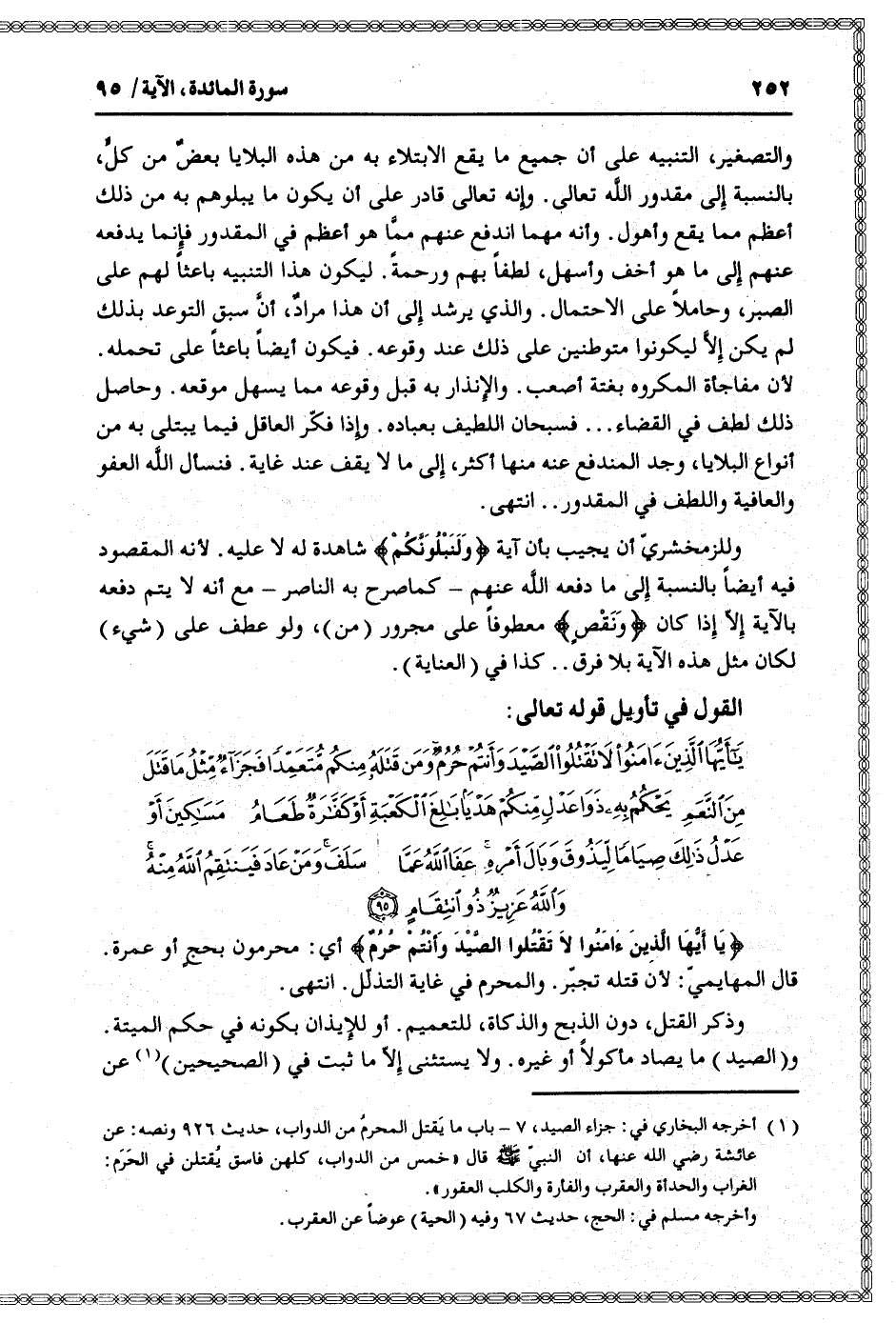 يا أَيُّهَا الَّذِينَ آمَنُوا لا تَقْتُلُوا الصَّيْدَ وَأَنْتُمْ حُرُمٌ وَمَنْ قَتَلَهُ مِنْكُمْ مُتَعَمِّداً فَجَزاءٌ مِثْلُ ما قَتَلَ مِنَ النَّعَمِ يَحْكُمُ بِهِ ذَوا عَدْلٍ مِنْكُمْ هَدْياً بالِغَ الْكَعْبَةِ أَوْ كَفَّارَةٌ طَعامُ مَساكِينَ أَوْ عَدْلُ ذلِكَ صِياماً لِيَذُوقَ وَبالَ أَمْرِهِ عَفَا اللَّهُ عَمَّا سَلَفَ وَمَنْ عادَ فَيَنْتَقِمُ اللَّهُ مِنْهُ وَاللَّهُ عَزِيزٌ ذُو انْتِقامٍ (95)