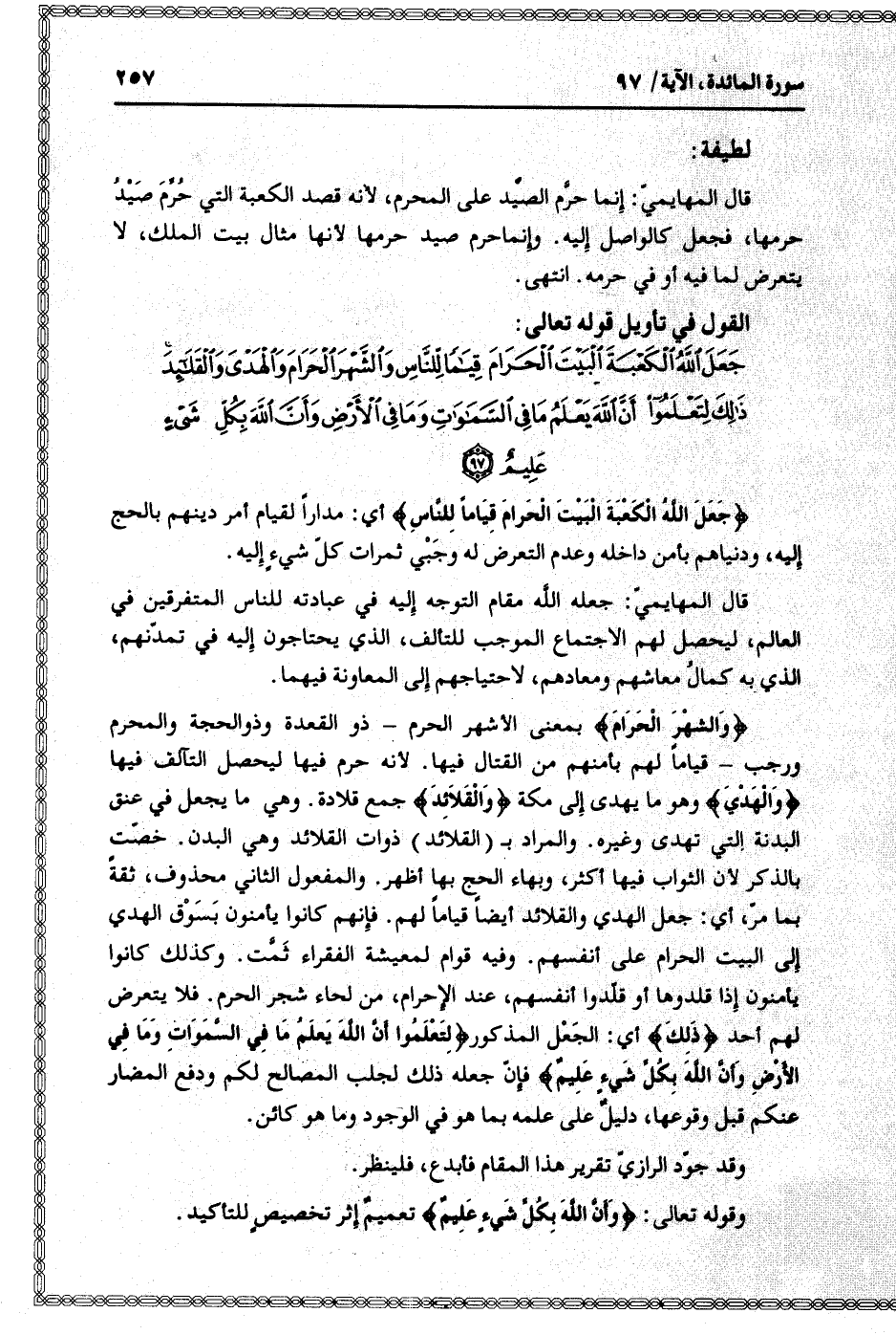 جَعَلَ اللَّهُ الْكَعْبَةَ الْبَيْتَ الْحَرامَ قِياماً لِلنَّاسِ وَالشَّهْرَ الْحَرامَ وَالْهَدْيَ وَالْقَلائِدَ ذلِكَ لِتَعْلَمُوا أَنَّ اللَّهَ يَعْلَمُ ما فِي السَّماواتِ وَما فِي الْأَرْضِ وَأَنَّ اللَّهَ بِكُلِّ شَيْءٍ عَلِيمٌ (97)