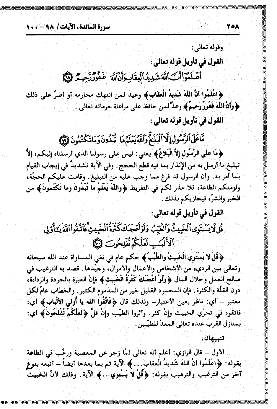 قُلْ لا يَسْتَوِي الْخَبِيثُ وَالطَّيِّبُ حكم عام في نفي المساواة عند الله سبحانه وتعالى بين الرديء من الأشخاص والأعمال والأموال، وجيّدها. قصد به الترغيب في صالح العمل وحلال المال وَلَوْ أَعْجَبَكَ كَثْرَةُ الْخَبِيثِ فإنّ العبرة بالجودة والرداءة، دون القلّة والكثرة. فإن المحمود القليل خير من المذموم الكثير. والخطاب عامّ لكل معتبر- أي: ناظر بعين الاعتبار- ولذلك قال فَاتَّقُوا اللَّهَ يا أُولِي الْأَلْبابِ أي: