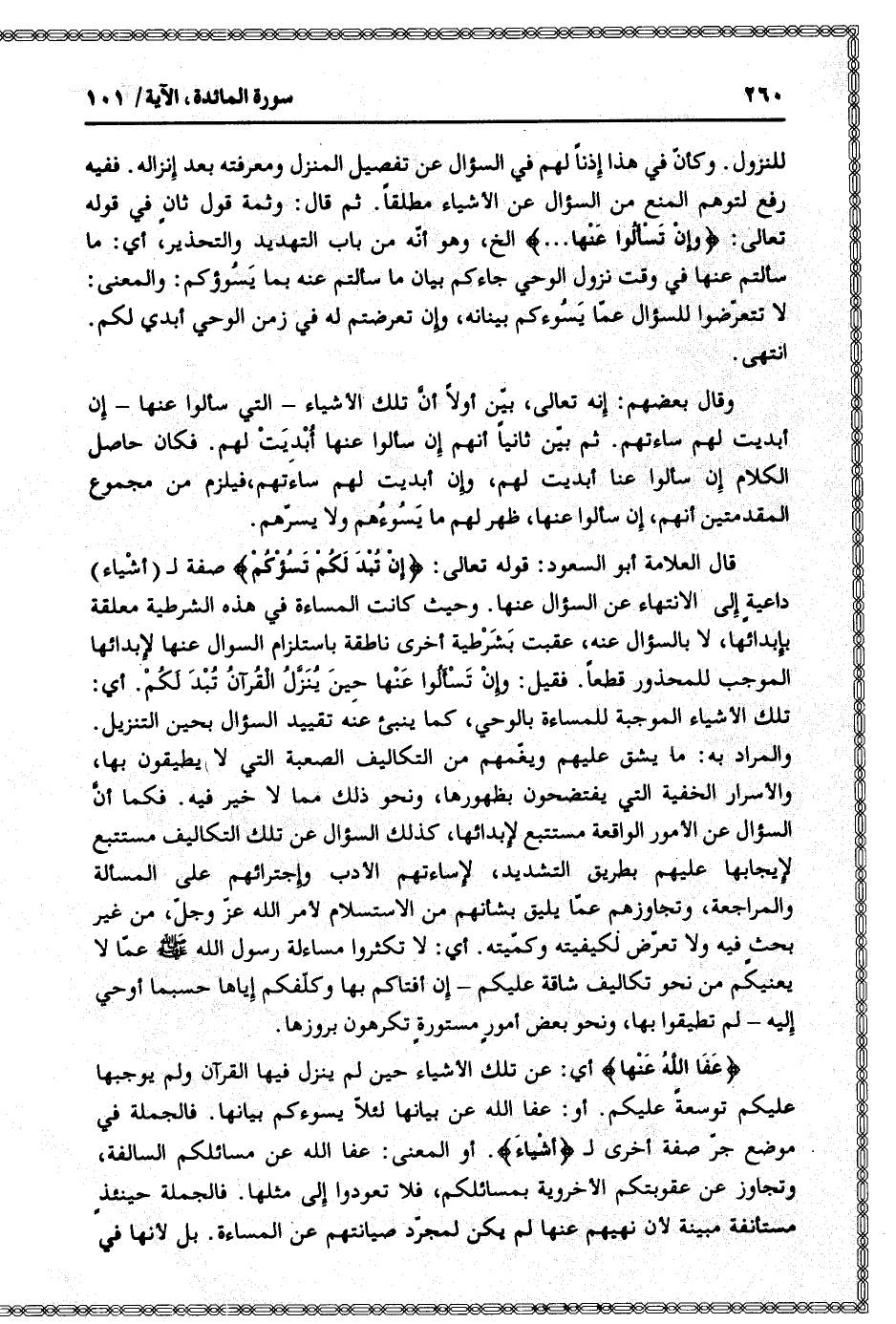 قال العلامة أبو السعود: قوله تعالى: إِنْ تُبْدَ لَكُمْ تَسُؤْكُمْ صفة ل (أشياء) داعية إلى الانتهاء عن السؤال عنها. وحيث كانت المساءة في هذه الشرطية معلقة بإبدائها، لا بالسؤال عنه، عقبت بشرطية أخرى ناطقة باستلزام السؤال عنها لإبدائها الموجب للمحذور قطعا. فقيل: وإن تسألوا عنها حين ينزّل القرآن تبد لكم. أي: