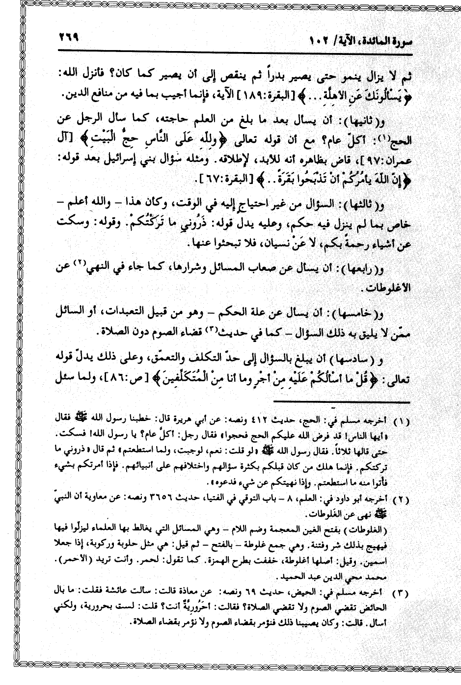 و (سادسها) أن يبلغ بالسؤال إلى حدّ التكلف والتعمّق، وعلى ذلك يدلّ قوله تعالى: قُلْ ما أَسْئَلُكُمْ عَلَيْهِ مِنْ أَجْرٍ وَما أَنَا مِنَ الْمُتَكَلِّفِينَ [ص: 86] ، ولما سئل