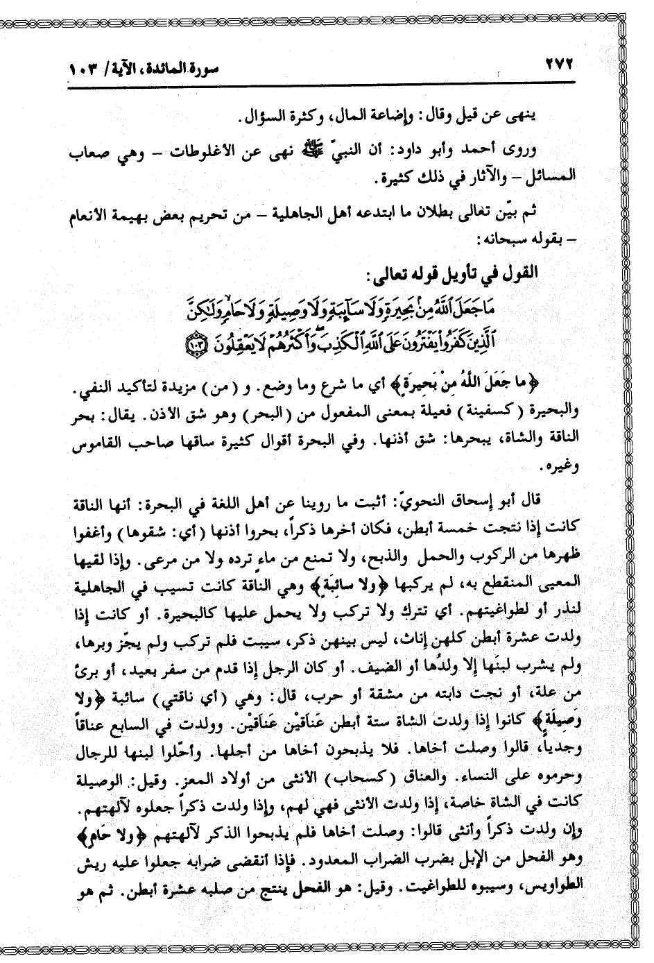قال أبو إسحاق النحويّ: أثبت ما روينا عن أهل اللغة في البحرة: أنها الناقة كانت إذا نتجت خمسة أبطن، فكان أخرها ذكرا، بحروا أذنها (أي: شقوها) وأغفوا ظهرها من الركوب والحمل والذبح، ولا تمنع من ماء ترده ولا من مرعى. وإذا لقيها المعيى المنقطع به، لم يركبها وَلا سائِبَةٍ وهي الناقة كانت تسيب في الجاهلية لنذر أو لطواغيتهم. أي تترك ولا تركب ولا يحمل عليها كالبحيرة. أو كانت إذا ولدت عشرة أبطن كلهن إناث، ليس بينهن ذكر، سيبت فلم تركب ولم يجزّ وبرها، ولم يشرب لبنها إلا ولدها أو الضيف. أو كان الرجل إذا قدم من سفر بعيد، أو برئ من علة، أو نجت دابته من مشقة أو حرب، قال: وهي (أي ناقتي) سائبة وَلا وَصِيلَةٍ كانوا إذا ولدت الشاة ستة أبطن عناقين عناقين. وولدت في السابع عناقا وجديا، قالوا وصلت أخاها. فلا يذبحون أخاها من أجلها. وأحلّوا لبنها للرجال وحرموه على النساء. والعناق (كسحاب) الأنثى من أولاد المعز. وقيل: الوصيلة كانت في الشاة خاصة، إذا ولدت الأنثى فهي لهم، وإذا ولدت ذكرا جعلوه لآلهتهم.