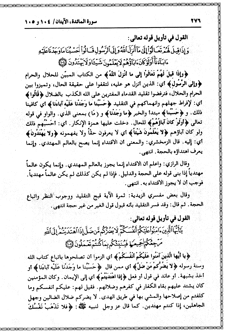 يا أَيُّهَا الَّذِينَ آمَنُوا عَلَيْكُمْ أَنْفُسَكُمْ أي الزموا أن تصلحوها باتباع كتاب الله وسنة رسوله لا يَضُرُّكُمْ مَنْ ضَلَّ أي ممن قال حَسْبُنا ما وَجَدْنا عَلَيْهِ آباءَنا أو أخذ بشبهة. أو عاند في قول أو فعل إِذَا اهْتَدَيْتُمْ أي إلى الإيمان. وكأن المؤمنين كان يشتد عليهم بقاء الكفار في كفرهم وضلالهم. فقيل لهم: عليكم أنفسكم وما كلفتم من إصلاحها والمشي بها في طريق الهدى. لا يضركم ضلال الضالين وجهل الجاهلين، إذا كنتم مهتدين. كما قال عز وجل لنبيه صلى الله عليه وسلم: فَلا تَذْهَبْ نَفْسُكَ
