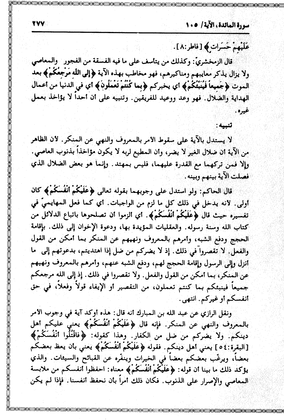 ونقل الرازي عن عبد الله بن المبارك أنه قال: هذه أوكد آية في وجوب الأمر بالمعروف والنهي عن المنكر. فإنه قال عَلَيْكُمْ أَنْفُسَكُمْ يعني عليكم أهل دينكم. ولا يضركم من ضل من الكفار. وهذا كقوله: فَاقْتُلُوا أَنْفُسَكُمْ [البقرة: 54] يعني أهل دينكم. فقوله عَلَيْكُمْ أَنْفُسَكُمْ يعني بأن يعظ بعضكم بعضا، ويرغّب بعضكم بعضا في الخيرات وينفّره عن القبائح والسيئات. والذي يؤكد ذلك ما بينا أن قوله: عَلَيْكُمْ أَنْفُسَكُمْ معناه: احفظوا أنفسكم من ملابسة المعاصي والإصرار على الذنوب. فكان ذلك أمرا بأن نحفظ أنفسنا. فإذا لم يكن