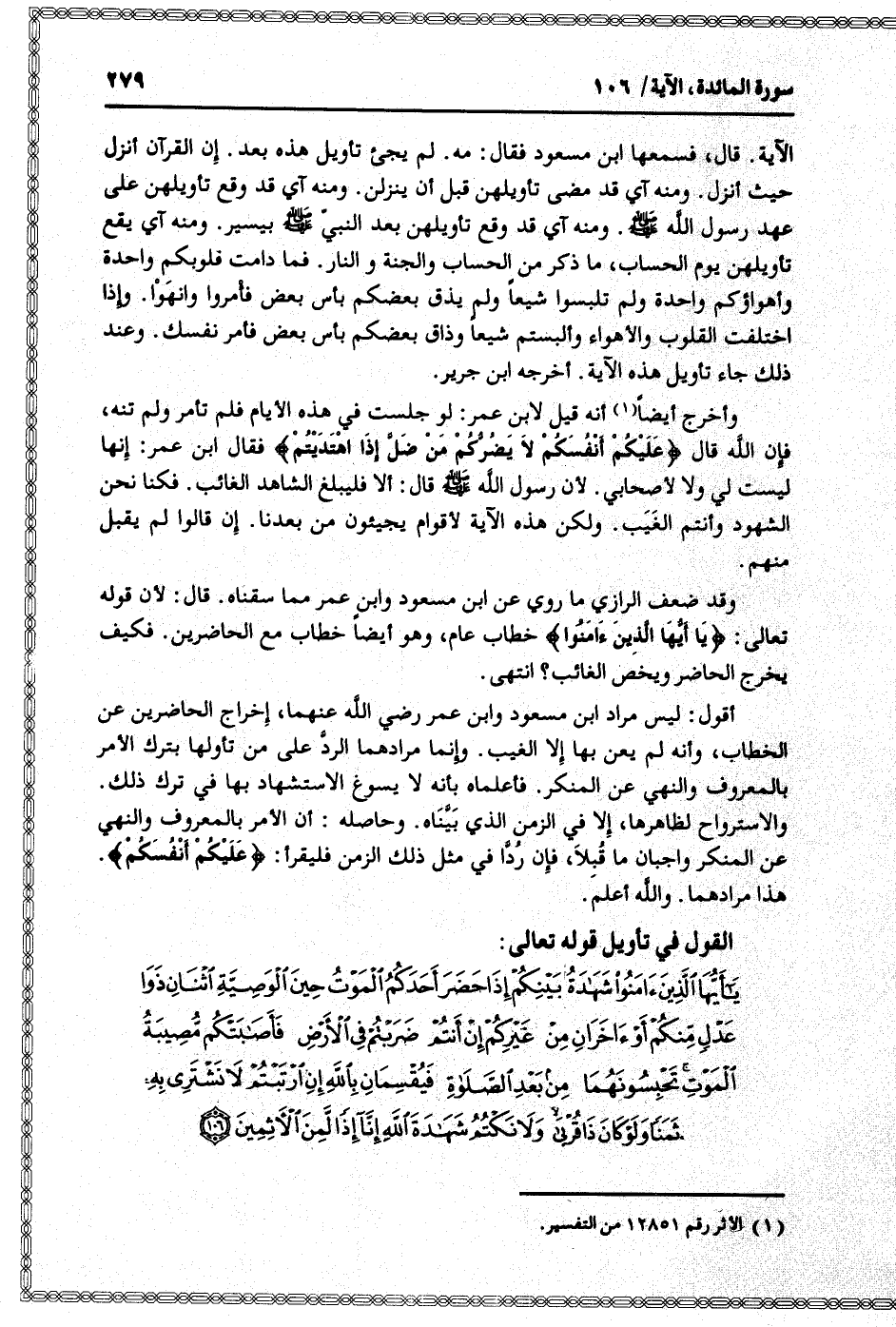 أنه قيل لابن عمر: لو جلست في هذه الأيام فلم تأمر ولم تنه، فإن الله قال عَلَيْكُمْ أَنْفُسَكُمْ لا يَضُرُّكُمْ مَنْ ضَلَّ إِذَا اهْتَدَيْتُمْ فقال ابن عمر: إنها ليست لي ولا لأصحابي. لأن رسول الله صلى الله عليه وسلم قال: ألا فليبلغ الشاهد الغائب. فكنا نحن الشهود وأنتم الغيب. ولكن هذه الآية لأقوام يجيئون من بعدنا. إن قالوا لم يقبل منهم