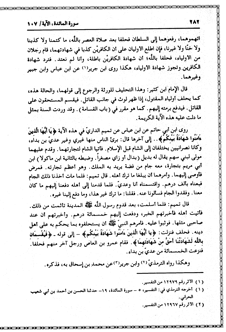 قال الإمام ابن كثير: وهذا التحليف للورثة والرجوع إلى قولهما، والحالة هذه، كما يحلف أولياء المقتول، إذا ظهر لوث في جانب القاتل. فيقسم المستحقون على القاتل. فيدفع برمته إليهم. كما هو مقرر في (باب القسامة) . وقد وردت السنة بمثل ما دلت عليه هذه الآية الكريمة.