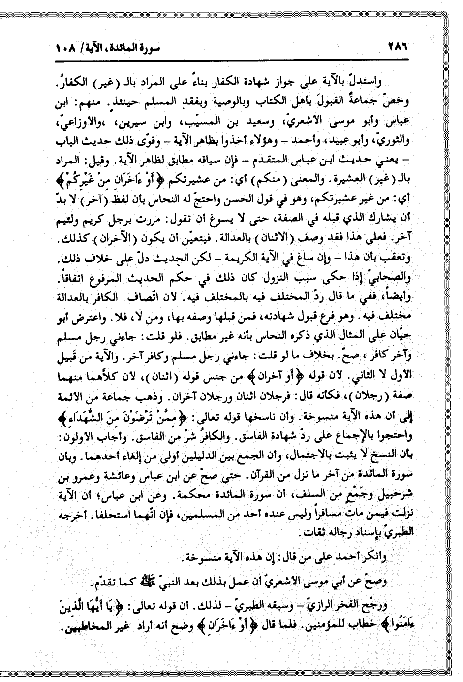 وخصّ جماعة القبول بأهل الكتاب وبالوصية وبفقد المسلم حينئذ. منهم: ابن عباس وأبو موسى الأشعريّ، وسعيد بن المسيّب، وابن سيرين، والأوزاعيّ، والثوريّ، وأبو عبيد، وأحمد- وهؤلاء أخذوا بظاهر الآية- وقوّى ذلك حديث الباب- يعني حديث ابن عباس المتقدم- فإن سياقه مطابق لظاهر الآية. وقيل: المراد بال (غير) العشيرة. والمعنى (منكم) أي: من عشيرتكم أَوْ آخَرانِ مِنْ غَيْرِكُمْ أي: من غير عشيرتكم، وهو في قول الحسن واحتجّ له النحاس بأن لفظ (آخر) لا بدّ أن يشارك الذي قبله في الصفة، حتى لا يسوغ أن تقول: مررت برجل كريم ولئيم آخر. فعلى هذا فقد وصف (الاثنان) بالعدالة. فيتعيّن أن يكون (الآخران) كذلك.