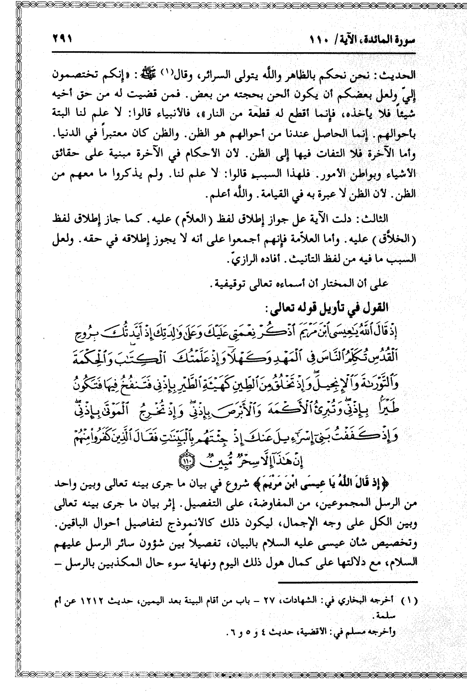إِذْ قالَ اللَّهُ يا عِيسَى ابْنَ مَرْيَمَ اذْكُرْ نِعْمَتِي عَلَيْكَ وَعَلى والِدَتِكَ إِذْ أَيَّدْتُكَ بِرُوحِ الْقُدُسِ تُكَلِّمُ النَّاسَ فِي الْمَهْدِ وَكَهْلاً وَإِذْ عَلَّمْتُكَ الْكِتابَ وَالْحِكْمَةَ وَالتَّوْراةَ وَالْإِنْجِيلَ وَإِذْ تَخْلُقُ مِنَ الطِّينِ كَهَيْئَةِ الطَّيْرِ بِإِذْنِي فَتَنْفُخُ فِيها فَتَكُونُ طَيْراً بِإِذْنِي وَتُبْرِئُ الْأَكْمَهَ وَالْأَبْرَصَ بِإِذْنِي وَإِذْ تُخْرِجُ الْمَوْتى بِإِذْنِي وَإِذْ كَفَفْتُ بَنِي إِسْرائِيلَ عَنْكَ إِذْ جِئْتَهُمْ بِالْبَيِّناتِ فَقالَ الَّذِينَ كَفَرُوا مِنْهُمْ إِنْ هذا إِلاَّ سِحْرٌ مُبِينٌ (110)