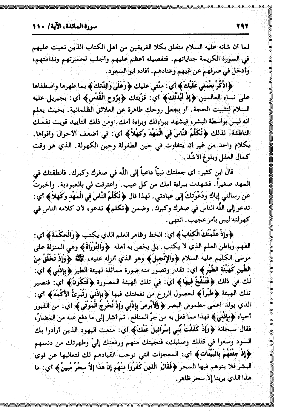اذْكُرْ نِعْمَتِي عَلَيْكَ أي: منّتي عليك وَعَلى والِدَتِكَ بما طهرها واصطفاها على نساء العالمين إِذْ أَيَّدْتُكَ أي: قوّيتك بِرُوحِ الْقُدُسِ أي: بجبريل عليه السلام لتثبيت الحجة. أو بجعل روحك طاهرة عن العلائق الظلمانية. بحيث يعلم أنه ليس بواسطة البشر، فيشهد ببراءتك وبراءة أمك. ومن ذلك التأييد قويت نفسك الناطقة. لذلك تُكَلِّمُ النَّاسَ فِي الْمَهْدِ وَكَهْلًا أي: في أضعف الأحوال وأقواها.
