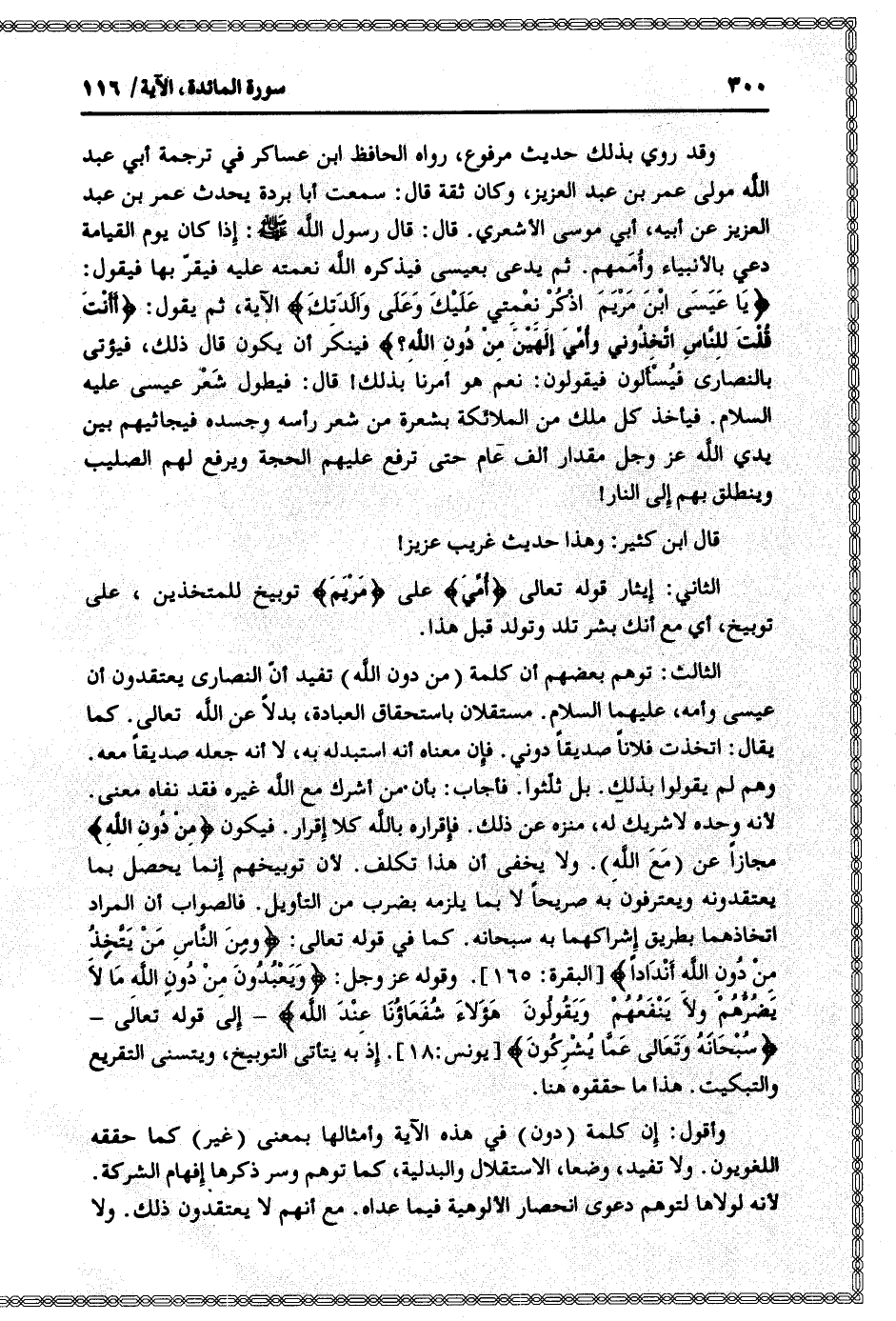 قال ابن كثير: وهذا حديث غريب عزيز! الثاني: إيثار قوله تعالى أُمِّي على مَرْيَمَ توبيخ للمتخذين، على توبيخ، أي مع أنك بشر تلد وتولد قبل هذا.