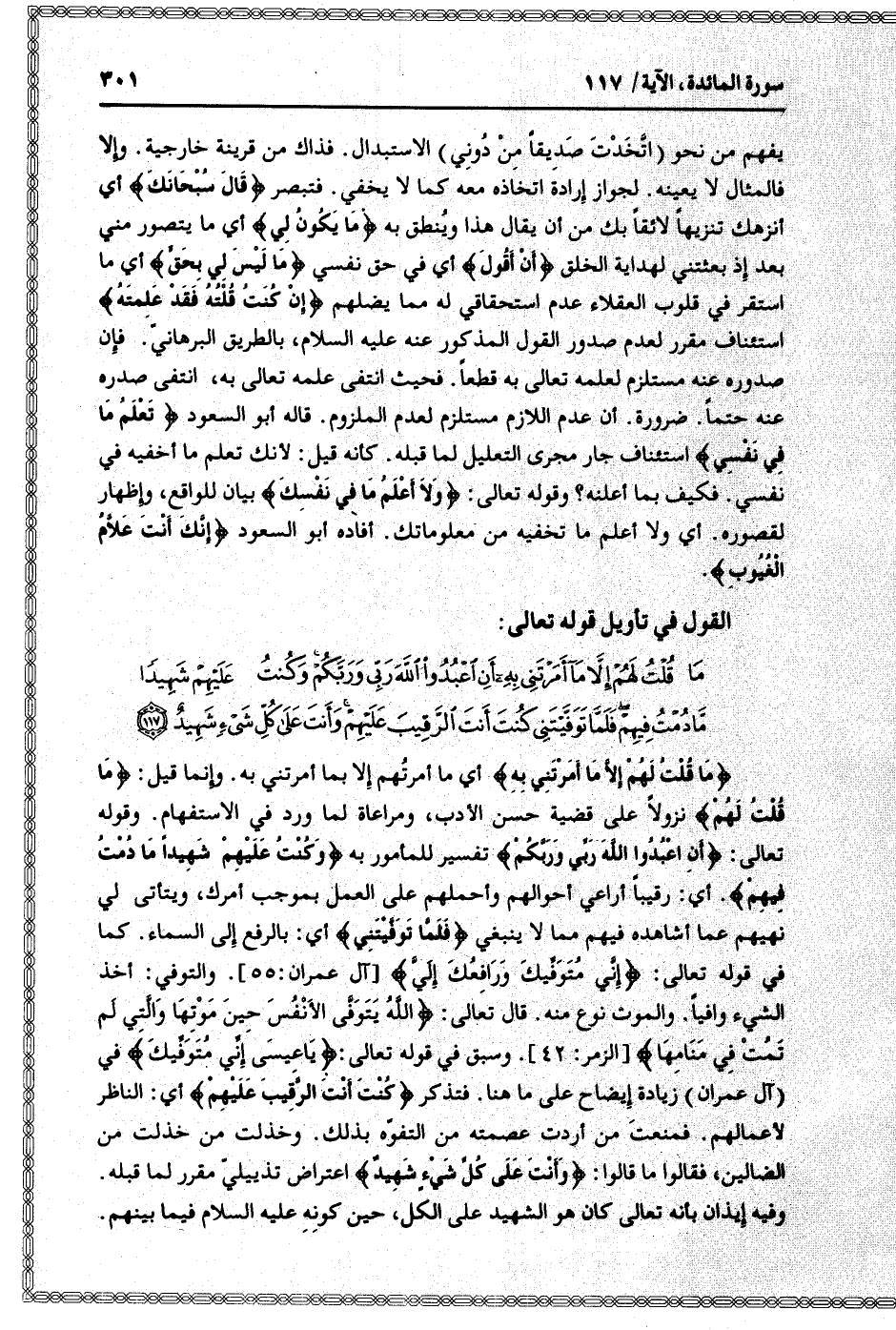 ما قُلْتُ لَهُمْ إِلاَّ ما أَمَرْتَنِي بِهِ أَنِ اعْبُدُوا اللَّهَ رَبِّي وَرَبَّكُمْ وَكُنْتُ عَلَيْهِمْ شَهِيداً ما دُمْتُ فِيهِمْ فَلَمَّا تَوَفَّيْتَنِي كُنْتَ أَنْتَ الرَّقِيبَ عَلَيْهِمْ وَأَنْتَ عَلى كُلِّ شَيْءٍ شَهِيدٌ (117)