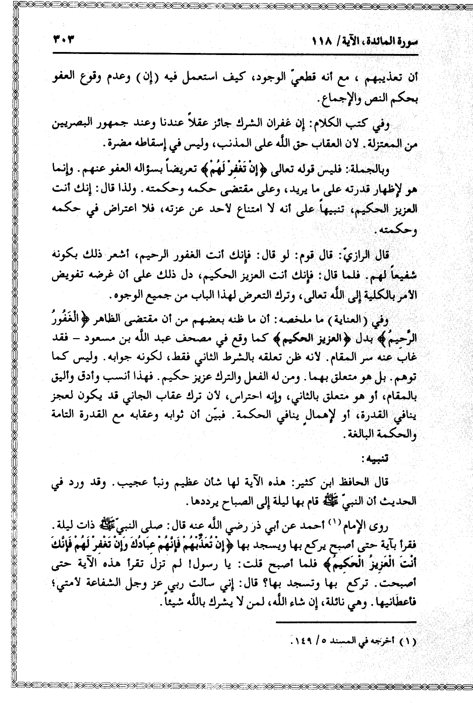 وبالجملة: فليس قوله تعالى إِنْ تَغْفِرْ لَهُمْ تعريضا بسؤاله العفو عنهم. وإنما هو لإظهار قدرته على ما يريد، وعلى مقتضى حكمه وحكمته. ولذا قال: إنك أنت العزيز الحكيم، تنبيها على أنه لا امتناع لأحد عن عزته، فلا اعتراض في حكمه وحكمته.
