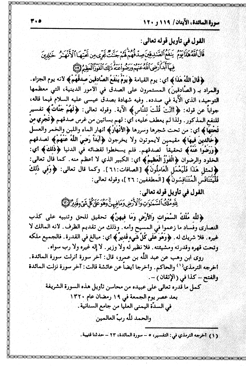 كمل ما قدره تعالى على عبيده من محاسن تأويل هذه السورة الشريفة بعد عصر يوم الجمعة في 19 رمضان عام 1320 في السدّة اليمنى العليا من جامع السنانية.