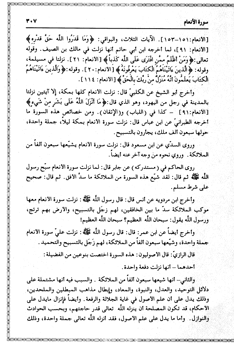 روى الحاكم في (مستدركه) عن جابر قال: لما نزلت سورة الأنعام سبّح رسول الله صلى الله عليه وسلم ثم قال: لقد شيّع هذه السورة من الملائكة ما سدّ الأفق
