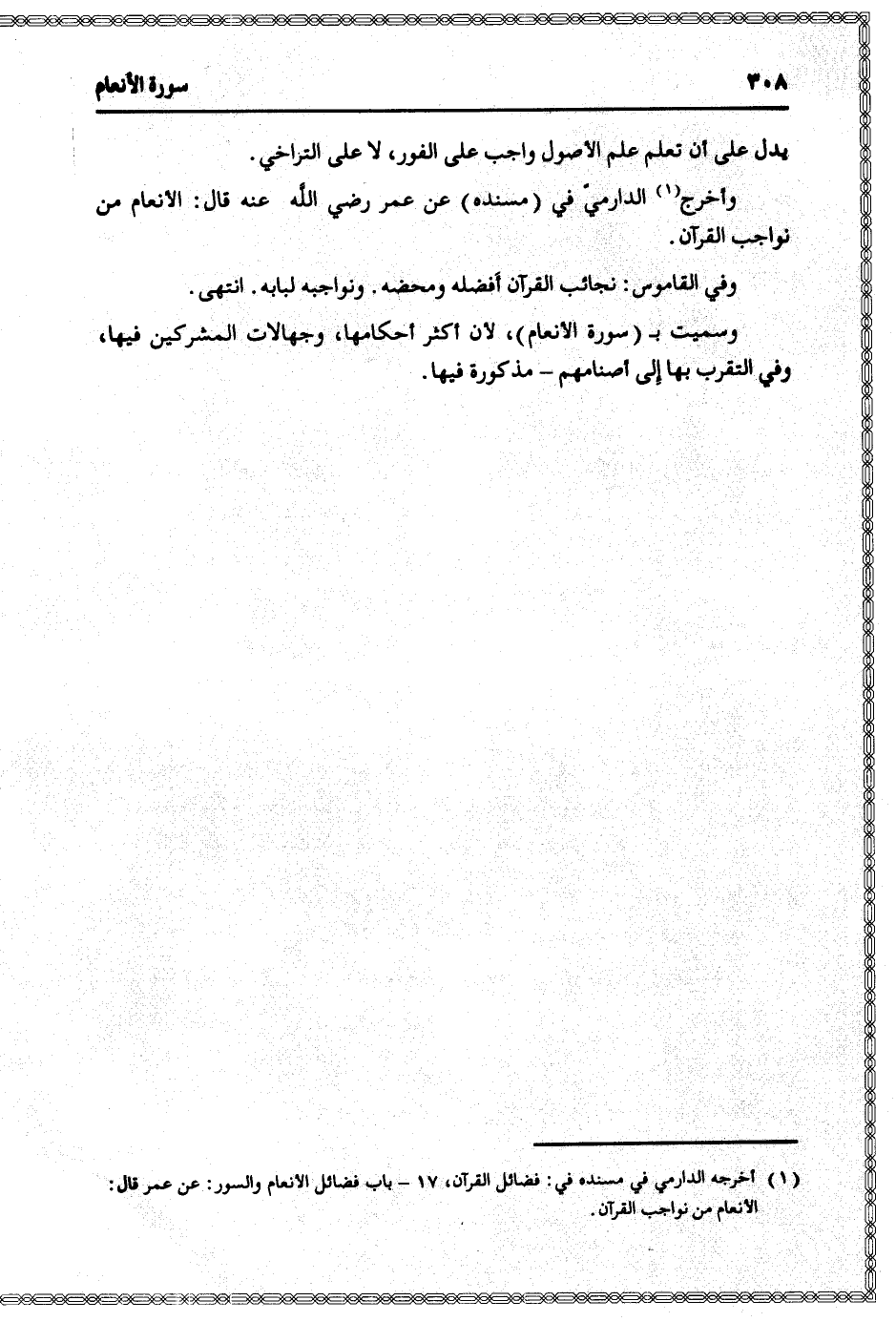 (1) أخرجه الدارمي في مسنده في: فضائل القرآن، 17- باب فضائل الأنعام والسور: عن عمر قال: