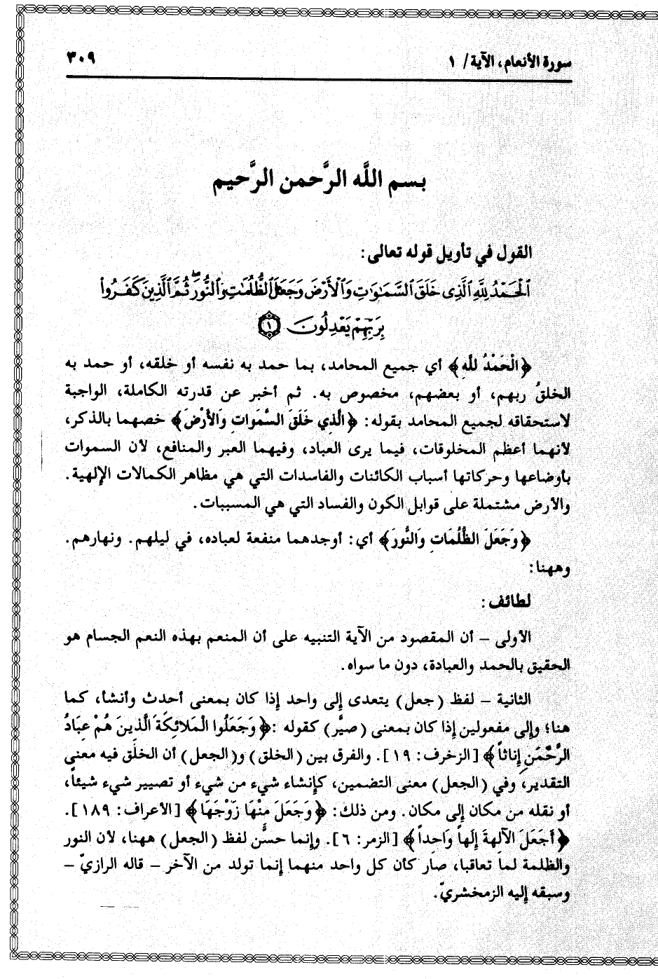 الْحَمْدُ لِلَّهِ الَّذِي خَلَقَ السَّماواتِ وَالْأَرْضَ وَجَعَلَ الظُّلُماتِ وَالنُّورَ ثُمَّ الَّذِينَ كَفَرُوا بِرَبِّهِمْ يَعْدِلُونَ (1)