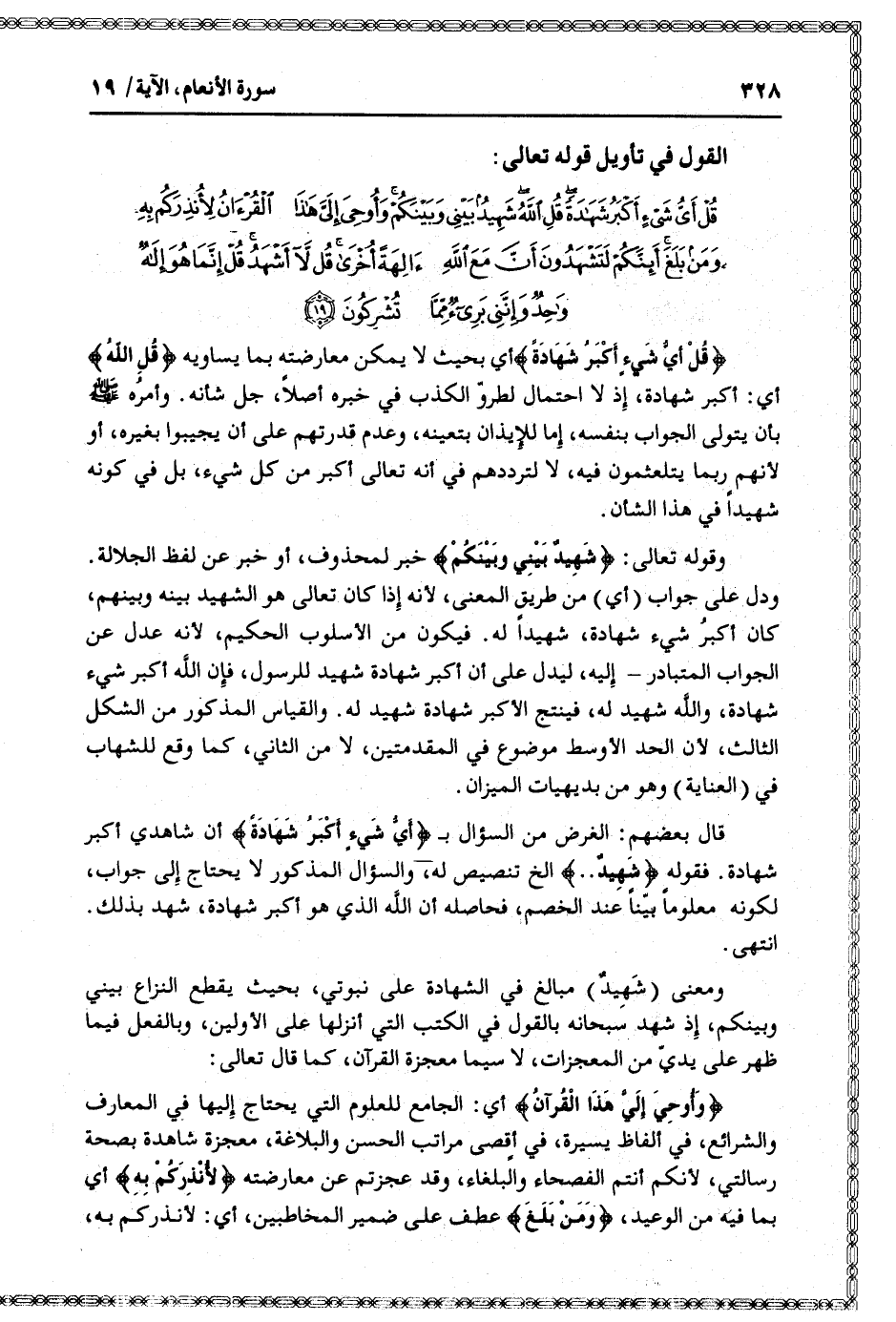 قُلْ أَيُّ شَيْءٍ أَكْبَرُ شَهادَةً قُلِ اللَّهُ شَهِيدٌ بَيْنِي وَبَيْنَكُمْ وَأُوحِيَ إِلَيَّ هذَا الْقُرْآنُ لِأُنْذِرَكُمْ بِهِ وَمَنْ بَلَغَ أَإِنَّكُمْ لَتَشْهَدُونَ أَنَّ مَعَ اللَّهِ آلِهَةً أُخْرى قُلْ لا أَشْهَدُ قُلْ إِنَّما هُوَ إِلهٌ واحِدٌ وَإِنَّنِي بَرِيءٌ مِمَّا تُشْرِكُونَ (19)