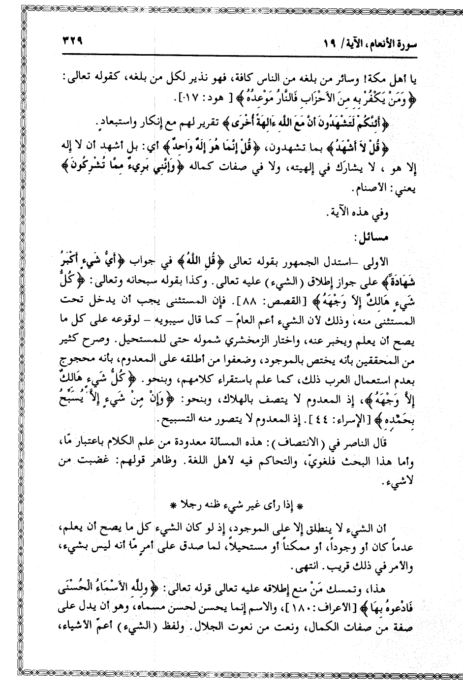 الأولى- استدل الجمهور بقوله تعالى قُلِ اللَّهُ في جواب أَيُّ شَيْءٍ أَكْبَرُ شَهادَةً على جواز إطلاق (الشيء) عليه تعالى. وكذا بقوله سبحانه وتعالى: كُلُّ شَيْءٍ هالِكٌ إِلَّا وَجْهَهُ [القصص: 88] . فإن المستثنى يجب أن يدخل تحت المستثنى منه، وذلك لأن الشيء أعم العامّ- كما قال سيبويه- لوقوعه على كل ما يصح أن يعلم ويخبر عنه، واختار الزمخشري شموله حتى للمستحيل. وصرح كثير من المحققين بأنه يختص بالموجود، وضعفوا من أطلقه على المعدوم، بأنه محجوج بعدم استعمال العرب ذلك، كما علم باستقراء كلامهم، وبنحو. كُلُّ شَيْءٍ هالِكٌ إِلَّا وَجْهَهُ، إذ المعدوم لا يتصف بالهلاك، وبنحو: وَإِنْ مِنْ شَيْءٍ إِلَّا يُسَبِّحُ بِحَمْدِهِ [الإسراء: 44] . إذ المعدوم لا يتصور منه التسبيح.