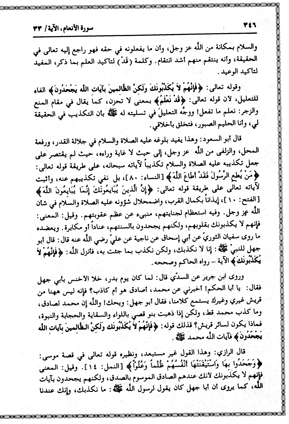 وروى ابن جرير عن السدّي قال: لما كان يوم بدر، خلا الأخنس بأبي جهل فقال: يا أبا الحكم! أخبرني عن محمد، أصادق هو أم كاذب؟ فإنه ليس هاهنا من قريش غيري وغيرك يستمع كلامنا، فقال أبو جهل: ويحك! والله إن محمد لصادق، وما كذب محمد قط، ولكن إذا ذهبت بنو قصي باللواء والسقاية والحجابة والنبوة، فماذا يكون لسائر قريش؟ فذلك قوله: فَإِنَّهُمْ لا يُكَذِّبُونَكَ وَلكِنَّ الظَّالِمِينَ بِآياتِ اللَّهِ يَجْحَدُونَ فآيات الله محمد صلى الله عليه وسلم.