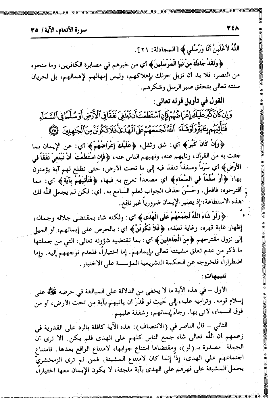 وَإِنْ كانَ كَبُرَ عَلَيْكَ إِعْراضُهُمْ فَإِنِ اسْتَطَعْتَ أَنْ تَبْتَغِيَ نَفَقاً فِي الْأَرْضِ أَوْ سُلَّماً فِي السَّماءِ فَتَأْتِيَهُمْ بِآيَةٍ وَلَوْ شاءَ اللَّهُ لَجَمَعَهُمْ عَلَى الْهُدى فَلا تَكُونَنَّ مِنَ الْجاهِلِينَ (35)