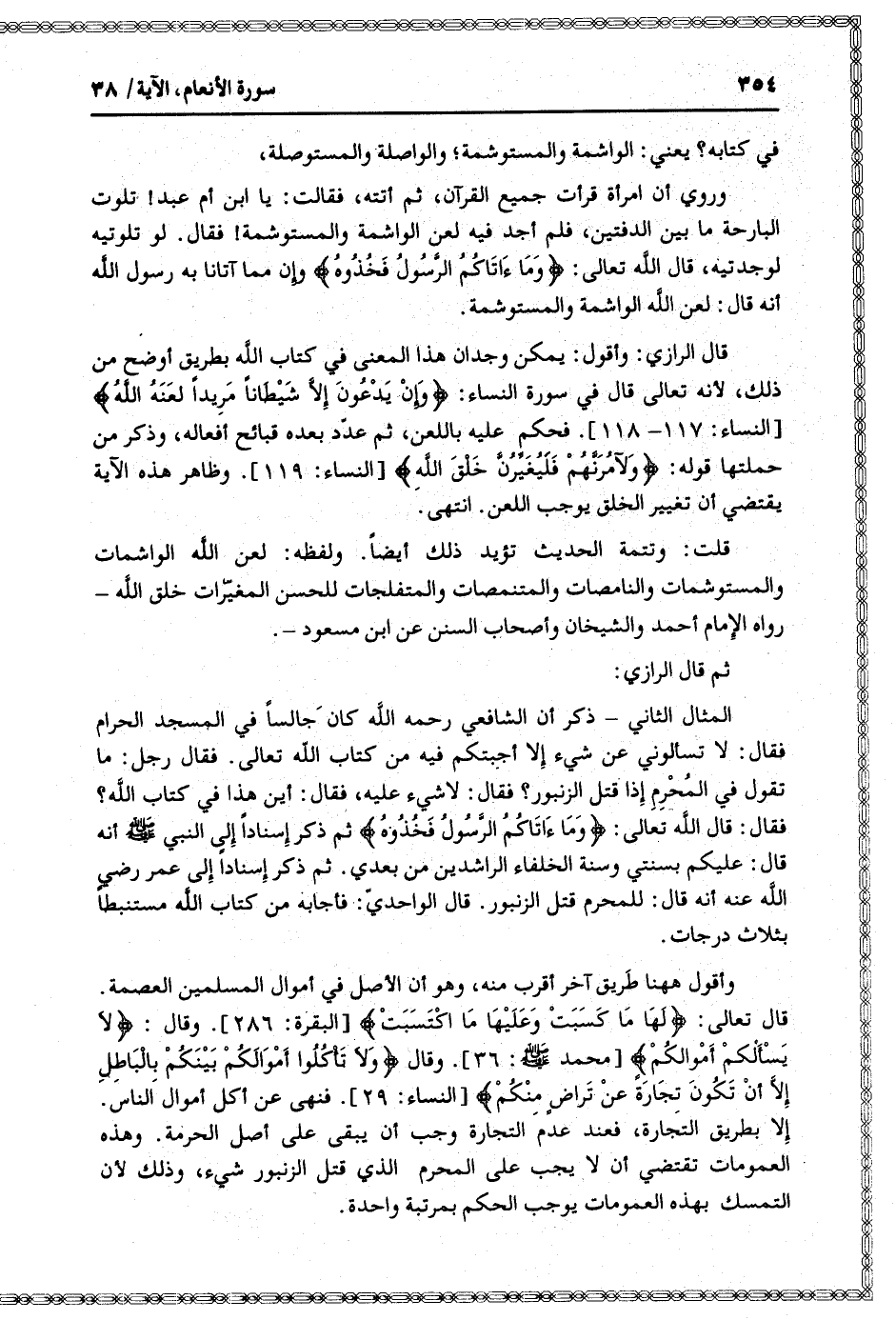 قال الرازي: وأقول: يمكن وجدان هذا المعنى في كتاب الله بطريق أوضح من ذلك، لأنه تعالى قال في سورة النساء: وَإِنْ يَدْعُونَ إِلَّا شَيْطاناً مَرِيداً لَعَنَهُ اللَّهُ [النساء: 117- 118] . فحكم عليه باللعن، ثم عدّد بعده قبائح أفعاله، وذكر من حملتها قوله: وَلَآمُرَنَّهُمْ فَلَيُغَيِّرُنَّ خَلْقَ اللَّهِ [النساء: 119] . وظاهر هذه الآية يقتضي أن تغيير الخلق يوجب اللعن. انتهى.