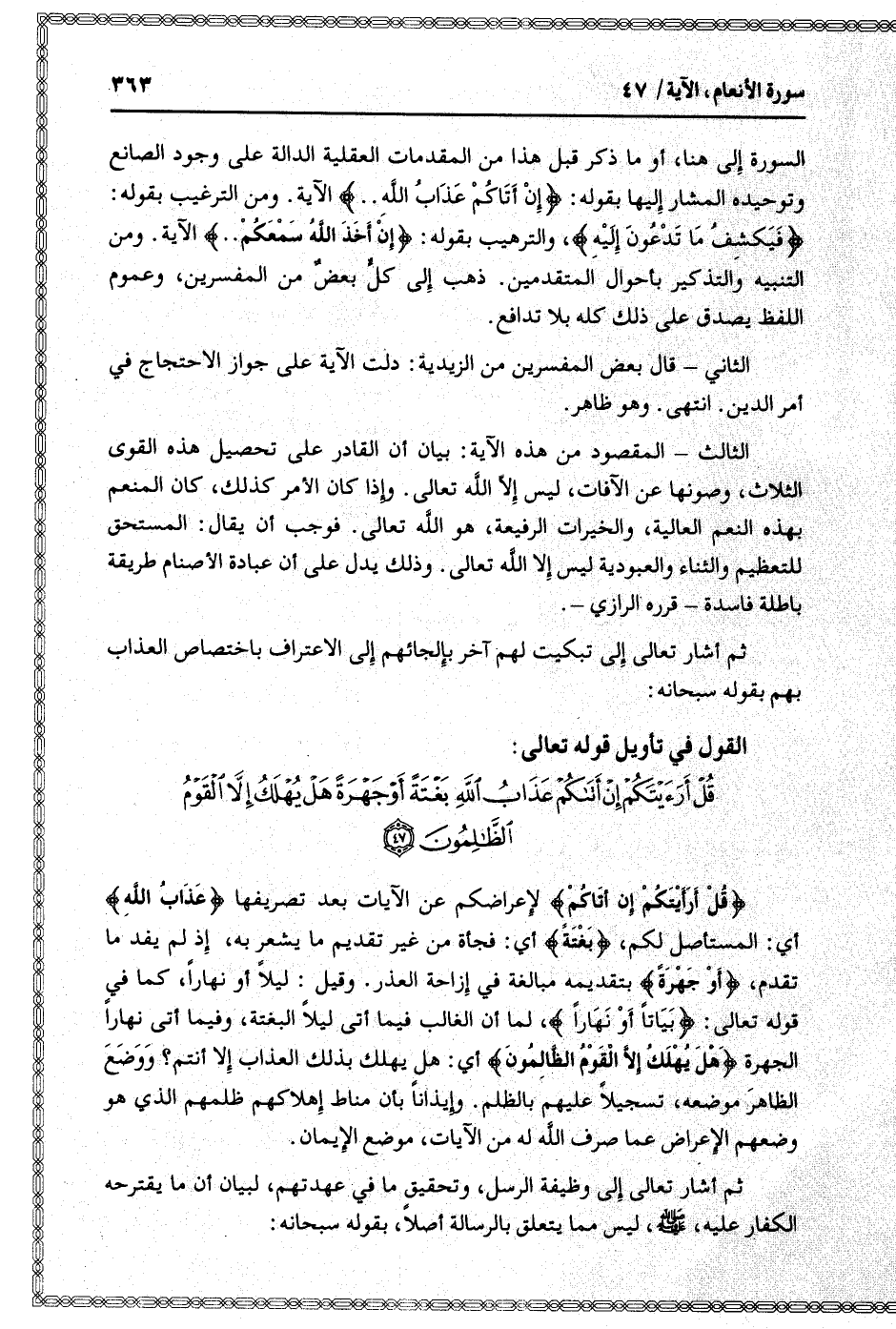 قُلْ أَرَأَيْتَكُمْ إِنْ أَتاكُمْ لإعراضكم عن الآيات بعد تصريفها عَذابُ اللَّهِ أي: المستأصل لكم، بَغْتَةً أي: فجأة من غير تقديم ما يشعر به، إذ لم يفد ما تقدم، أَوْ جَهْرَةً بتقديمه مبالغة في إزاحة العذر. وقيل: ليلا أو نهارا، كما في قوله تعالى: بَياتاً أَوْ نَهاراً، لما أن الغالب فيما أتى ليلا البغتة، وفيما أتى نهارا الجهرة هَلْ يُهْلَكُ إِلَّا الْقَوْمُ الظَّالِمُونَ أي: هل يهلك بذلك العذاب إلا أنتم؟ ووضع الظاهر موضعه، تسجيلا عليهم بالظلم. وإيذانا بأن مناط إهلاكهم ظلمهم الذي هو وضعهم الإعراض عما صرف الله له من الآيات، موضع الإيمان.