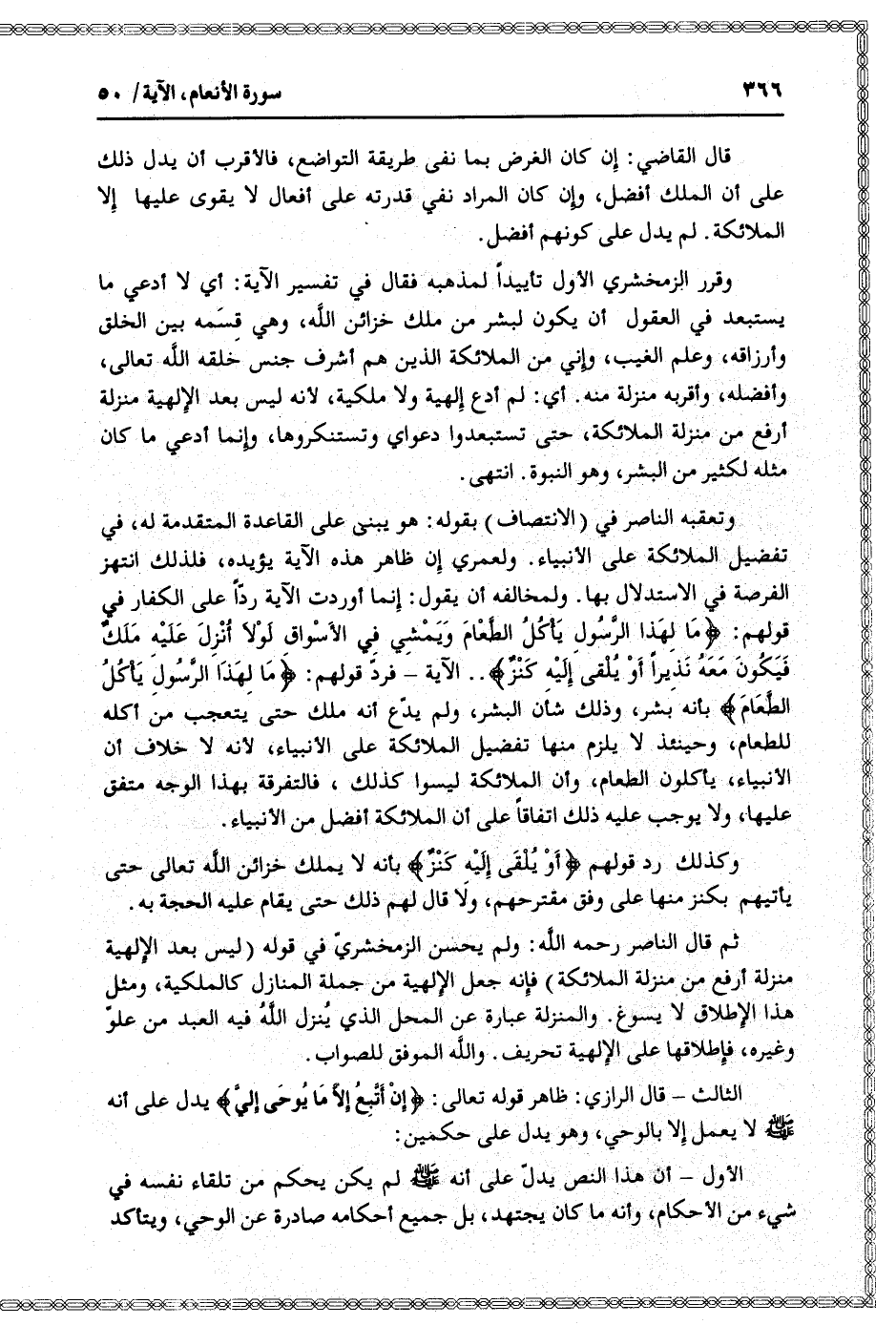 وتعقبه الناصر في (الانتصاف) بقوله: هو يبنى على القاعدة المتقدمة له، في تفضيل الملائكة على الأنبياء. ولعمري إن ظاهر هذه الآية يؤيده، فلذلك انتهز الفرصة في الاستدلال بها. ولمخالفه أن يقول: إنما أوردت الآية ردّا على الكفار في قولهم: مالِ هذَا الرَّسُولِ يَأْكُلُ الطَّعامَ وَيَمْشِي فِي الْأَسْواقِ لَوْلا أُنْزِلَ إِلَيْهِ مَلَكٌ فَيَكُونَ مَعَهُ نَذِيراً أَوْ يُلْقى إِلَيْهِ كَنْزٌ.. الآية- فردّ قولهم: مالِ هذَا الرَّسُولِ يَأْكُلُ الطَّعامَ بأنه بشر، وذلك شأن البشر، ولم يدّع أنه ملك حتى يتعجب من أكله للطعام، وحينئذ لا يلزم منها تفضيل الملائكة على الأنبياء، لأنه لا خلاف أن الأنبياء، يأكلون الطعام، وأن الملائكة ليسوا كذلك، فالتفرقة بهذا الوجه متفق عليها، ولا يوجب عليه ذلك اتفاقا على أن الملائكة أفضل من الأنبياء.