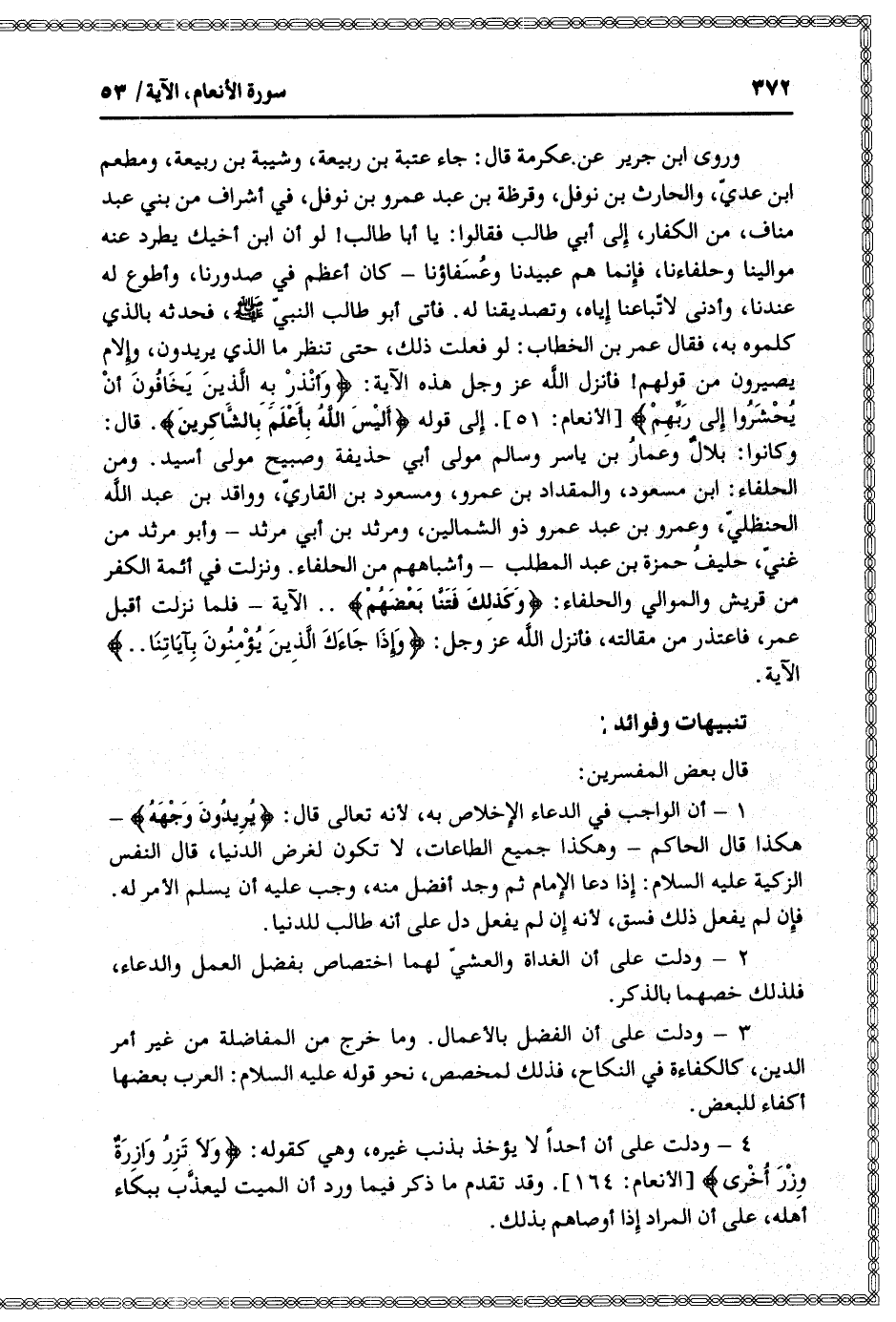 وروى ابن جرير عن عكرمة قال: جاء عتبة بن ربيعة، وشيبة بن ربيعة، ومطعم ابن عديّ، والحارث بن نوفل، وقرظة بن عبد عمرو بن نوفل، في أشراف من بني عبد مناف، من الكفار، إلى أبي طالب فقالوا: يا أبا طالب! لو أن ابن أخيك يطرد عنه موالينا وحلفاءنا، فإنما هم عبيدنا وعسفاؤنا- كان أعظم في صدورنا، وأطوع له عندنا، وأدنى لاتّباعنا إياه، وتصديقنا له. فأتى أبو طالب النبيّ صلى الله عليه وسلم، فحدثه بالذي كلموه به، فقال عمر بن الخطاب: لو فعلت ذلك، حتى تنظر ما الذي يريدون، وإلام يصيرون من قولهم! فأنزل الله عز وجل هذه الآية: وَأَنْذِرْ بِهِ الَّذِينَ يَخافُونَ أَنْ يُحْشَرُوا إِلى رَبِّهِمْ [الأنعام: 51] . إلى قوله أَلَيْسَ اللَّهُ بِأَعْلَمَ بِالشَّاكِرِينَ. قال: