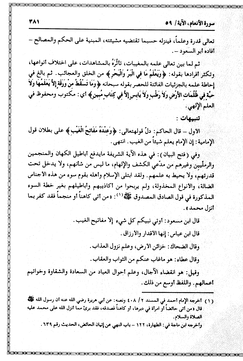 الأول- قال الحاكم: دلّ قوله تعالى: وَعِنْدَهُ مَفاتِحُ الْغَيْبِ على بطلان قول الإمامية: إن الإمام يعلم شيئا من الغيب. انتهى.