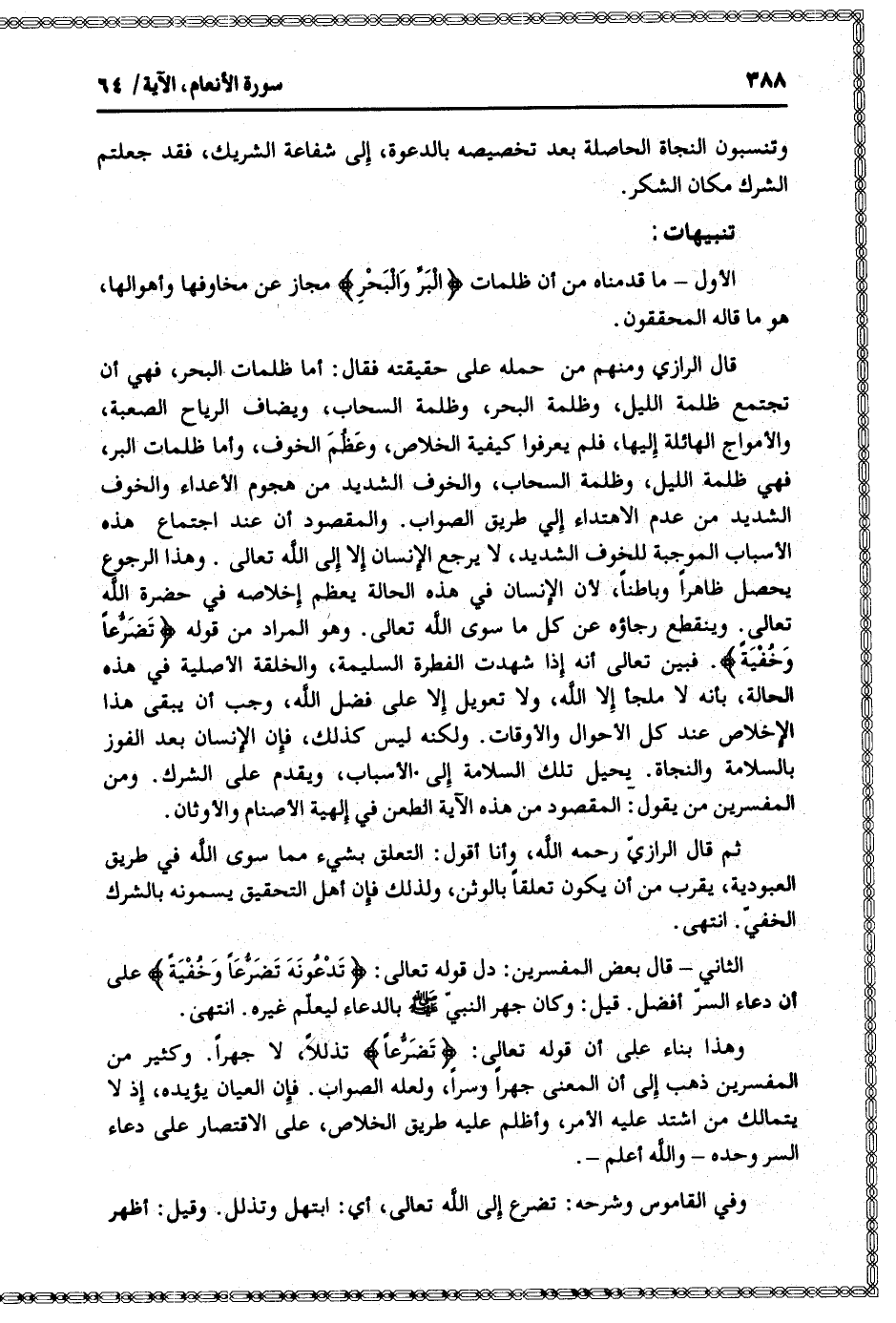 قال الرازي ومنهم من حمله على حقيقته فقال: أما ظلمات البحر، فهي أن تجتمع ظلمة الليل، وظلمة البحر، وظلمة السحاب، ويضاف الرياح الصعبة، والأمواج الهائلة إليها، فلم يعرفوا كيفية الخلاص، وعظم الخوف، وأما ظلمات البر، فهي ظلمة الليل، وظلمة السحاب، والخوف الشديد من هجوم الأعداء والخوف الشديد من عدم الاهتداء إلي طريق الصواب. والمقصود أن عند اجتماع هذه الأسباب الموجبة للخوف الشديد، لا يرجع الإنسان إلا إلى الله تعالى. وهذا الرجوع يحصل ظاهرا وباطنا، لأن الإنسان في هذه الحالة يعظم إخلاصه في حضرة الله تعالى. وينقطع رجاؤه عن كل ما سوى الله تعالى. وهو المراد من قوله تَضَرُّعاً وَخُفْيَةً. فبين تعالى أنه إذا شهدت الفطرة السليمة، والخلقة الأصلية في هذه الحالة، بأنه لا ملجأ إلا الله، ولا تعويل إلا على فضل الله، وجب أن يبقى هذا الإخلاص عند كل الأحوال والأوقات. ولكنه ليس كذلك، فإن الإنسان بعد الفوز بالسلامة والنجاة. يحيل تلك السلامة إلى الأسباب، ويقدم على الشرك. ومن المفسرين من يقول: المقصود من هذه الآية الطعن في إلهية الأصنام والأوثان.
