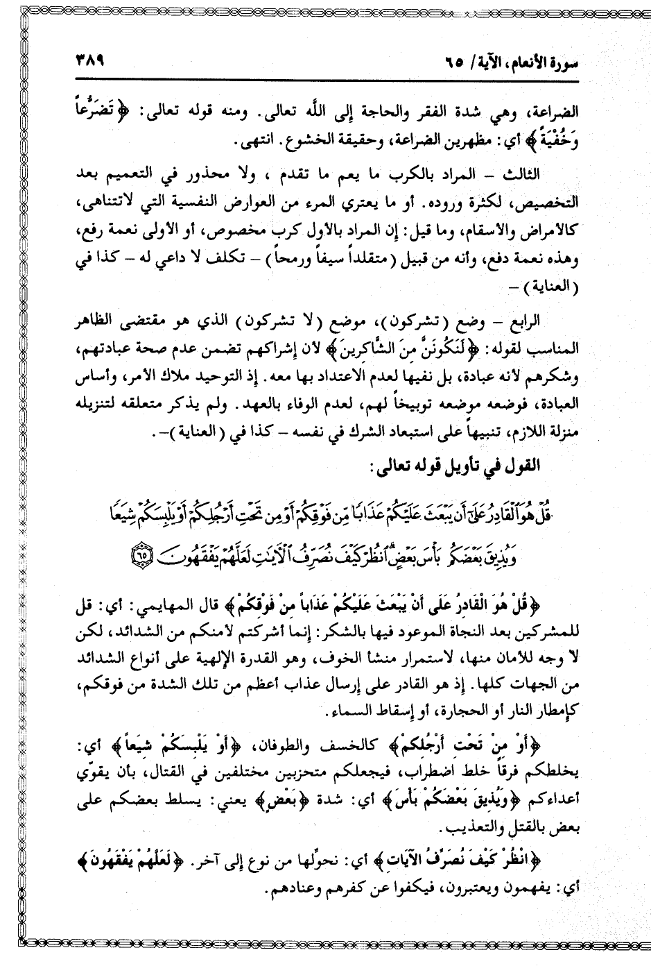 قُلْ هُوَ الْقادِرُ عَلى أَنْ يَبْعَثَ عَلَيْكُمْ عَذاباً مِنْ فَوْقِكُمْ أَوْ مِنْ تَحْتِ أَرْجُلِكُمْ أَوْ يَلْبِسَكُمْ شِيَعاً وَيُذِيقَ بَعْضَكُمْ بَأْسَ بَعْضٍ انْظُرْ كَيْفَ نُصَرِّفُ الْآياتِ لَعَلَّهُمْ يَفْقَهُونَ (65)