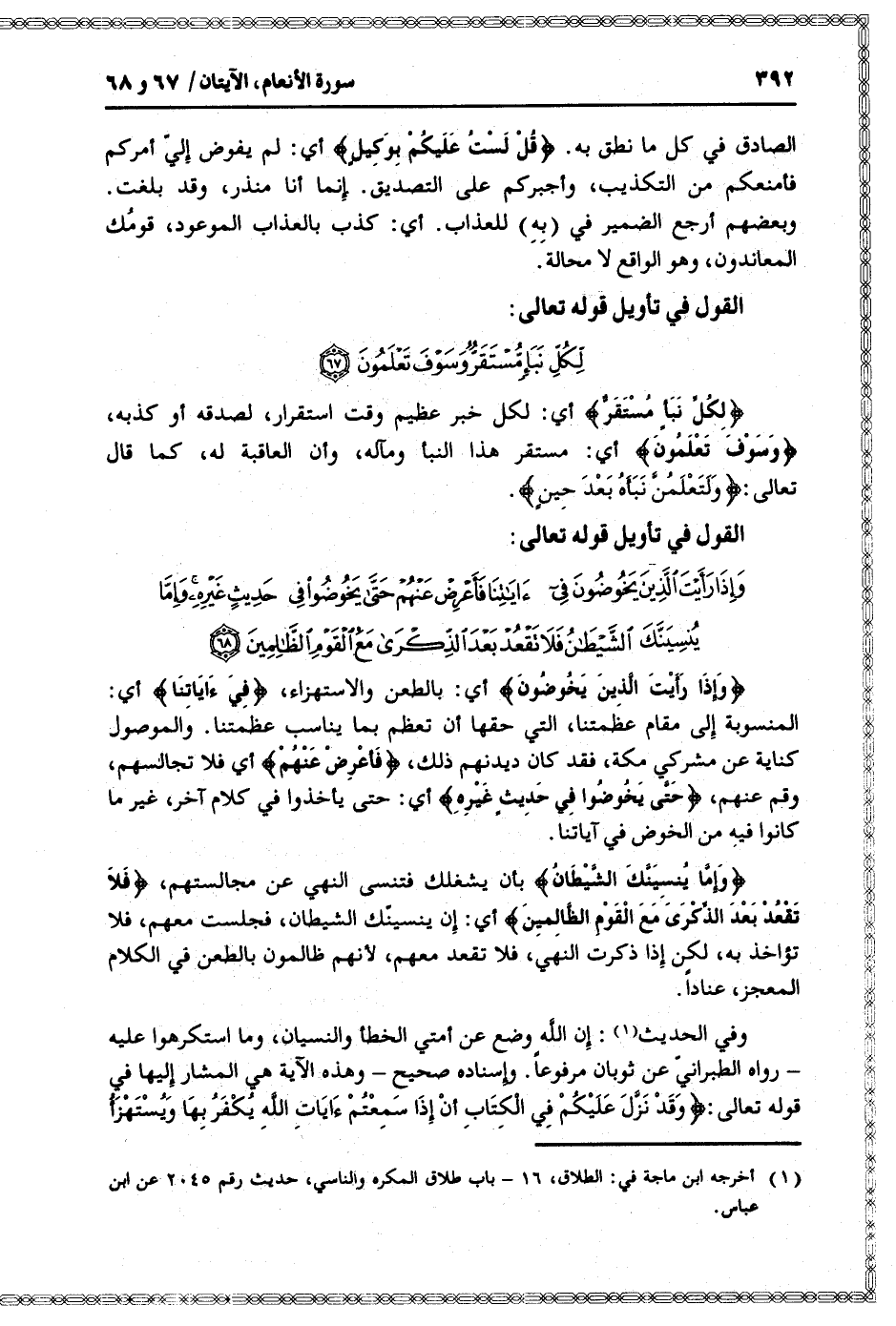وَإِذا رَأَيْتَ الَّذِينَ يَخُوضُونَ فِي آياتِنا فَأَعْرِضْ عَنْهُمْ حَتَّى يَخُوضُوا فِي حَدِيثٍ غَيْرِهِ وَإِمَّا يُنْسِيَنَّكَ الشَّيْطانُ فَلا تَقْعُدْ بَعْدَ الذِّكْرى مَعَ الْقَوْمِ الظَّالِمِينَ (68)