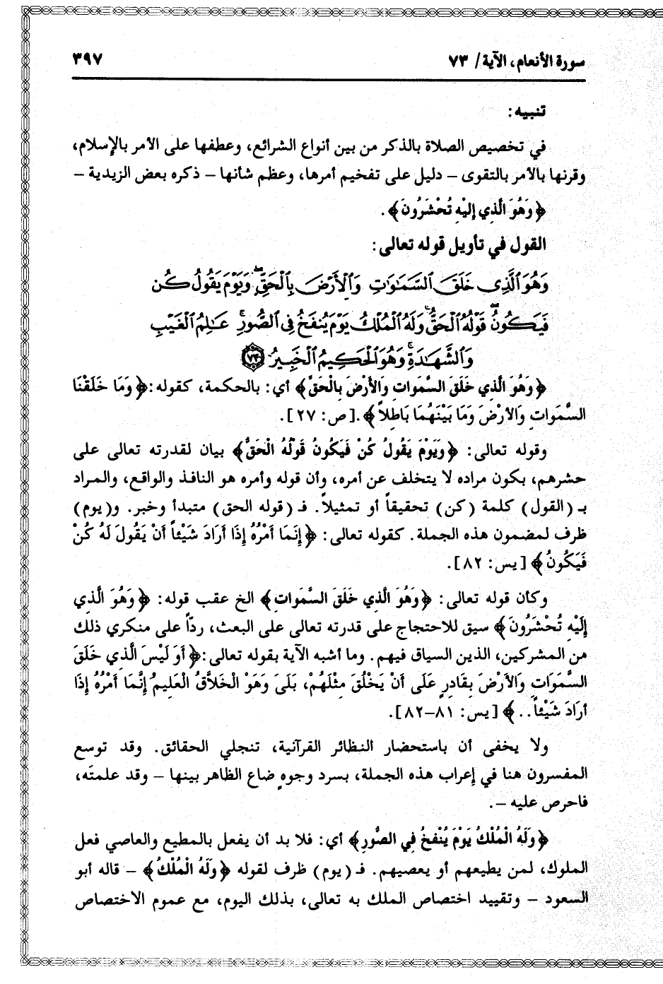وَهُوَ الَّذِي خَلَقَ السَّماواتِ وَالْأَرْضَ بِالْحَقِّ وَيَوْمَ يَقُولُ كُنْ فَيَكُونُ قَوْلُهُ الْحَقُّ وَلَهُ الْمُلْكُ يَوْمَ يُنْفَخُ فِي الصُّورِ عالِمُ الْغَيْبِ وَالشَّهادَةِ وَهُوَ الْحَكِيمُ الْخَبِيرُ (73)