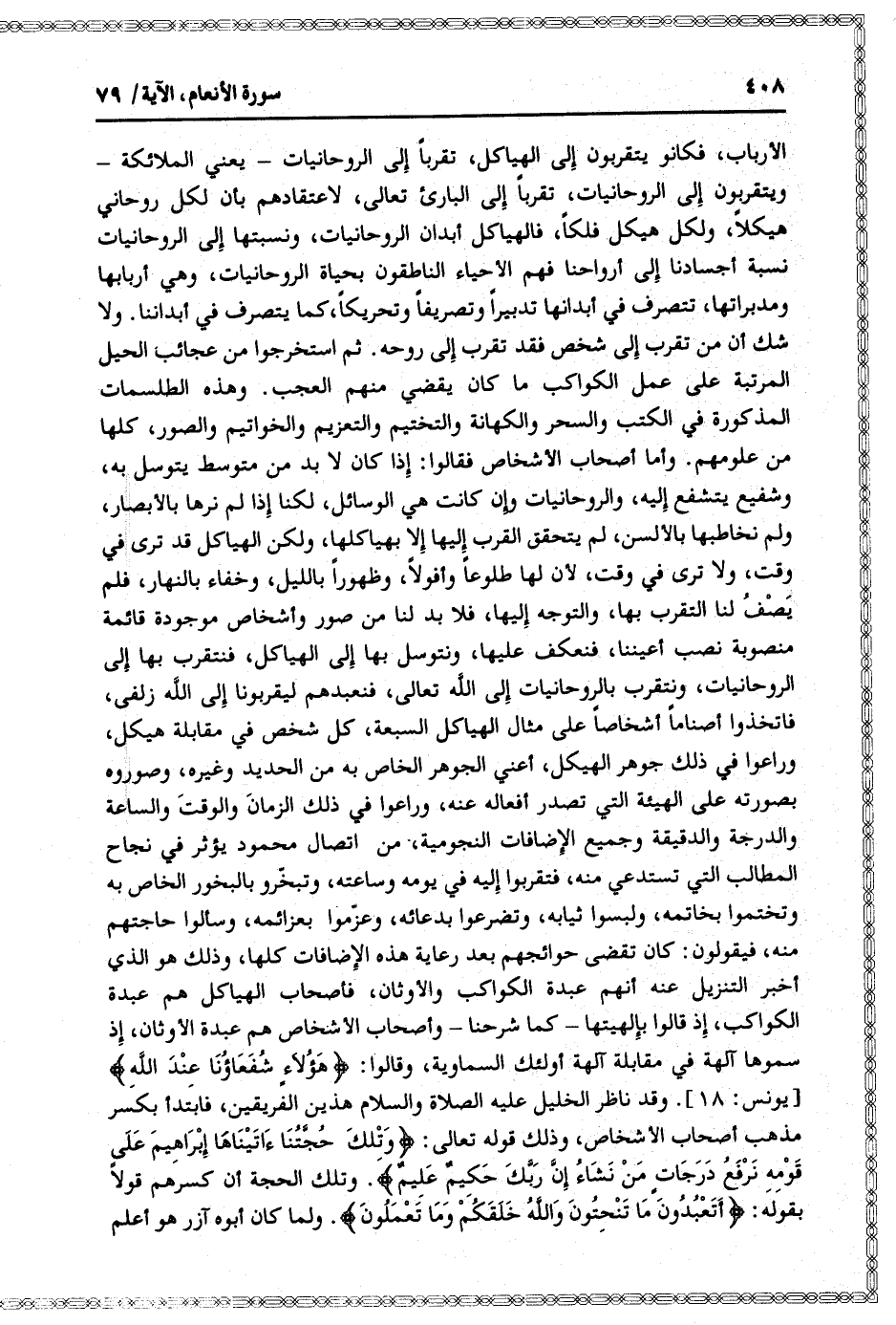 الأرباب، فكانوا يتقربون إلى الهياكل، تقربا إلى الروحانيات- يعني الملائكة- ويتقربون إلى الروحانيات، تقربا إلى البارئ تعالى، لاعتقادهم بأن لكل روحاني هيكلا، ولكل هيكل فلكا، فالهياكل أبدان الروحانيات، ونسبتها إلى الروحانيات نسبة أجسادنا إلى أرواحنا فهم الأحياء الناطقون بحياة الروحانيات، وهي أربابها ومدبراتها، تتصرف في أبدانها تدبيرا وتصريفا وتحريكا، كما يتصرف في أبداننا. ولا شك أن من تقرب إلى شخص فقد تقرب إلى روحه. ثم استخرجوا من عجائب الحيل المرتبة على عمل الكواكب ما كان يقضي منهم العجب. وهذه الطلسمات المذكورة في الكتب والسحر والكهانة والتختيم والتعزيم والخواتيم والصور، كلها من علومهم. وأما أصحاب الأشخاص فقالوا: إذا كان لا بد من متوسط يتوسل به، وشفيع يتشفع إليه، والروحانيات وإن كانت هي الوسائل، لكنا إذا لم نرها بالأبصار، ولم نخاطبها بالألسن، لم يتحقق القرب إليها إلا بهياكلها، ولكن الهياكل قد ترى في وقت، ولا ترى في وقت، لأن لها طلوعا وأفولا، وظهورا بالليل، وخفاء بالنهار، فلم يصف لنا التقرب بها، والتوجه إليها، فلا بد لنا من صور وأشخاص موجودة قائمة منصوبة نصب أعيننا، فنعكف عليها، ونتوسل بها إلى الهياكل، فنتقرب بها إلى الروحانيات، ونتقرب بالروحانيات إلى الله تعالى، فنعبدهم ليقربونا إلى الله زلفى، فاتخذوا أصناما أشخاصا على مثال الهياكل السبعة، كل شخص في مقابلة هيكل، وراعوا في ذلك جوهر الهيكل، أعني الجوهر الخاص به من الحديد وغيره، وصوروه بصورته على الهيئة التي تصدر أفعاله عنه، وراعوا في ذلك الزمان والوقت والساعة والدرجة والدقيقة وجميع الإضافات النجومية، من اتصال محمود يؤثر في نجاح المطالب التي تستدعي منه، فتقربوا إليه في يومه وساعته، وتبخّروا بالبخور الخاص به وتختموا بخاتمه، ولبسوا ثيابه، وتضرعوا بدعائه، وعزّموا بعزائمه، وسألوا حاجتهم منه، فيقولون: كان تقضى حوائجهم بعد رعاية هذه الإضافات كلها، وذلك هو الذي أخبر التنزيل عنه أنهم عبدة الكواكب والأوثان، فأصحاب الهياكل هم عبدة الكواكب، إذ قالوا بإلهيتها- كما شرحنا- وأصحاب الأشخاص هم عبدة الأوثان، إذ سموها آلهة في مقابلة آلهة أولئك السماوية، وقالوا: هؤُلاءِ شُفَعاؤُنا عِنْدَ اللَّهِ [يونس: 18] . وقد ناظر الخليل عليه الصلاة والسلام هذين الفريقين، فابتدأ بكسر مذهب أصحاب الأشخاص، وذلك قوله تعالى: وَتِلْكَ حُجَّتُنا آتَيْناها إِبْراهِيمَ عَلى قَوْمِهِ نَرْفَعُ دَرَجاتٍ مَنْ نَشاءُ إِنَّ رَبَّكَ حَكِيمٌ عَلِيمٌ. وتلك الحجة أن كسرهم قولا بقوله: أَتَعْبُدُونَ ما تَنْحِتُونَ وَاللَّهُ خَلَقَكُمْ وَما تَعْمَلُونَ. ولما كان أبوه آزر هو أعلم