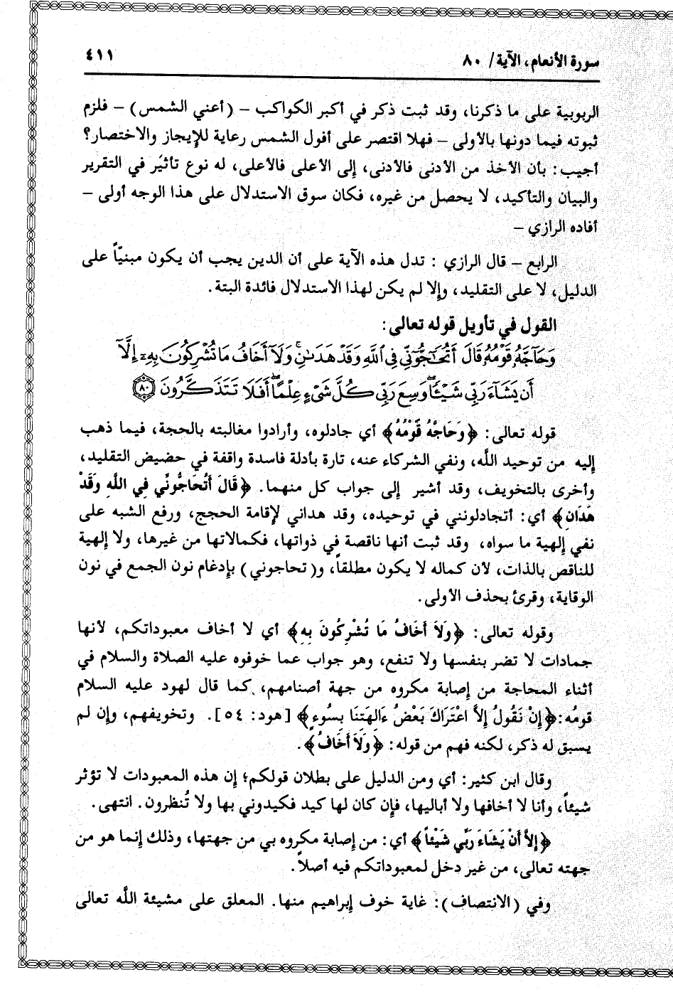 وَحاجَّهُ قَوْمُهُ قالَ أَتُحاجُّونِّي فِي اللَّهِ وَقَدْ هَدانِ وَلا أَخافُ ما تُشْرِكُونَ بِهِ إِلاَّ أَنْ يَشاءَ رَبِّي شَيْئاً وَسِعَ رَبِّي كُلَّ شَيْءٍ عِلْماً أَفَلا تَتَذَكَّرُونَ (80)