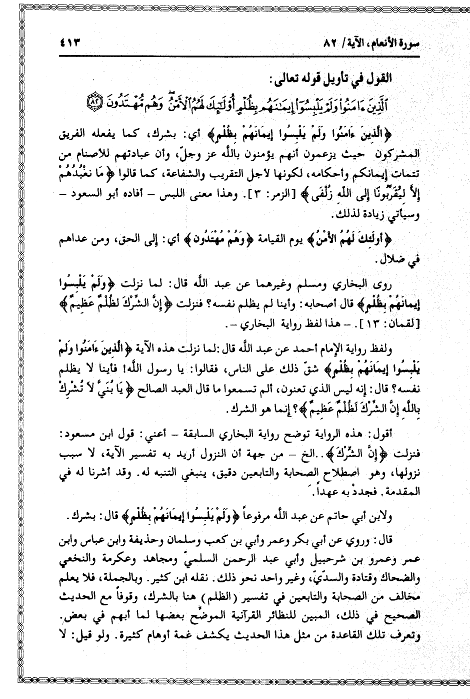 ولفظ رواية الإمام أحمد عن عبد الله قال: لما نزلت هذه الآية الَّذِينَ آمَنُوا وَلَمْ يَلْبِسُوا إِيمانَهُمْ بِظُلْمٍ شقّ ذلك على الناس، فقالوا: يا رسول الله! فأينا لا يظلم نفسه؟ قال: إنه ليس الذي تعنون، ألم تسمعوا ما قال العبد الصالح يا بُنَيَّ لا تُشْرِكْ بِاللَّهِ إِنَّ الشِّرْكَ لَظُلْمٌ عَظِيمٌ؟ إنما هو الشرك.