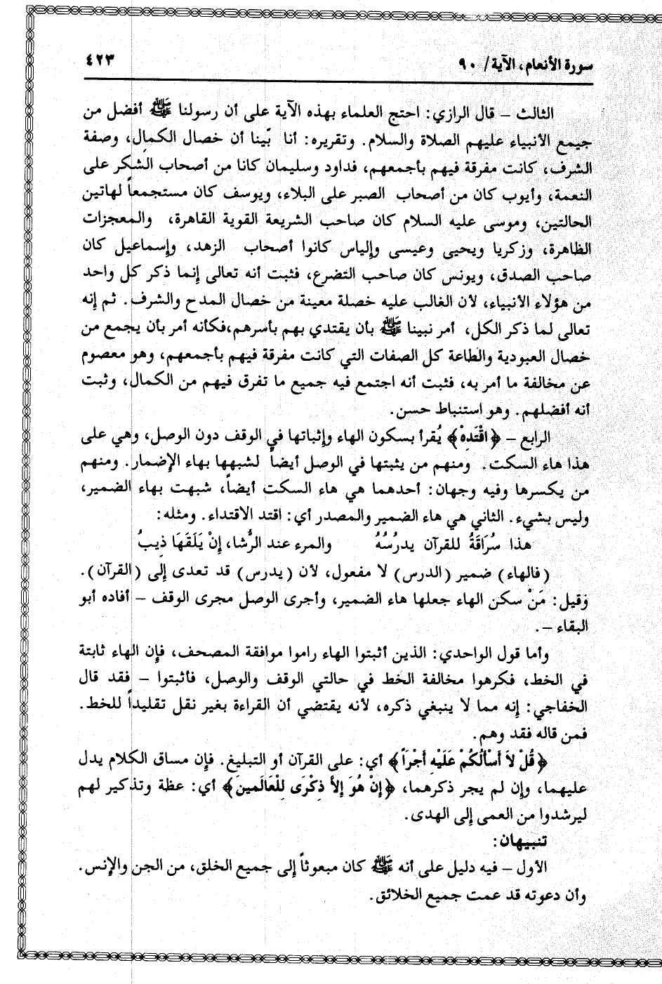 الثالث- قال الرازي: احتج العلماء بهذه الآية على أن رسولنا صلى الله عليه وسلم أفضل من جميع الأنبياء عليهم الصلاة والسلام. وتقريره: أنا بيّنا أن خصال الكمال، وصفة الشرف، كانت مفرقة فيهم بأجمعهم، فداود وسليمان كانا من أصحاب الشكر على النعمة، وأيوب كان من أصحاب الصبر على البلاء، ويوسف كان مستجمعا لهاتين الحالتين، وموسى عليه السلام كان صاحب الشريعة القوية القاهرة، والمعجزات الظاهرة، وزكريا ويحيى وعيسى وإلياس كانوا أصحاب الزهد، وإسماعيل كان صاحب الصدق، ويونس كان صاحب التضرع، فثبت أنه تعالى إنما ذكر كل واحد من هؤلاء الأنبياء، لأن الغالب عليه خصلة معينة من خصال المدح والشرف. ثم إنه تعالى لما ذكر الكل، أمر نبينا صلى الله عليه وسلم بأن يقتدي بهم بأسرهم، فكأنه أمر بأن يجمع من خصال العبودية والطاعة كل الصفات التي كانت مفرقة فيهم بأجمعهم، وهو معصوم عن مخالفة ما أمر به، فثبت أنه اجتمع فيه جميع ما تفرق فيهم من الكمال، وثبت أنه أفضلهم. وهو استنباط حسن.