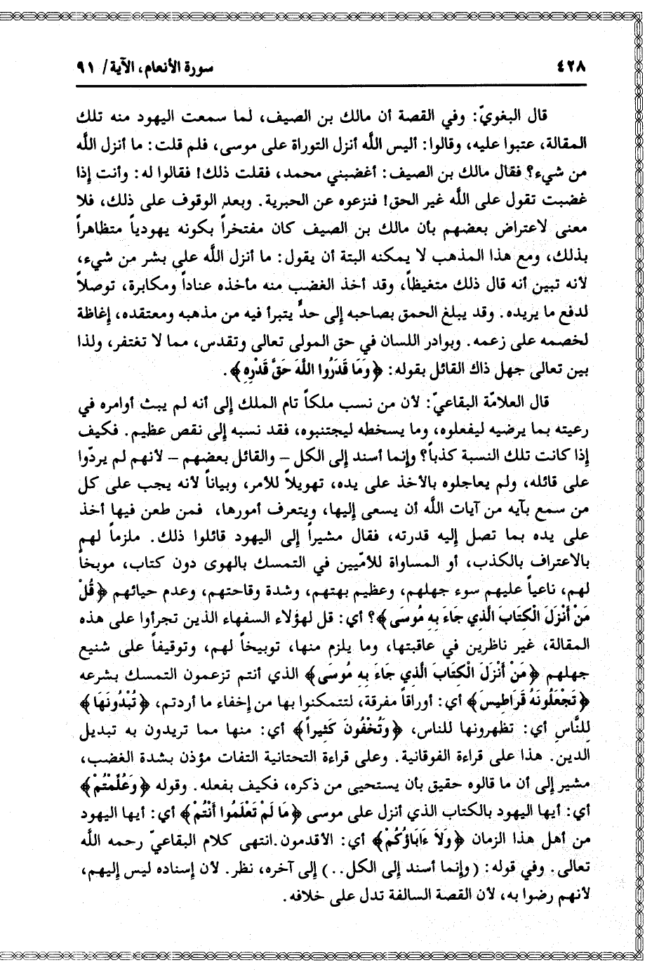 قال البغويّ: وفي القصة أن مالك بن الصيف، لما سمعت اليهود منه تلك المقالة، عتبوا عليه، وقالوا: أليس الله أنزل التوراة على موسى، فلم قلت: ما أنزل الله من شيء؟ فقال مالك بن الصيف: أغضبني محمد، فقلت ذلك! فقالوا له: وأنت إذا غضبت تقول على الله غير الحق! فنزعوه عن الحبرية. وبعد الوقوف على ذلك، فلا معنى لاعتراض بعضهم بأن مالك بن الصيف كان مفتخرا بكونه يهوديا متظاهرا بذلك، ومع هذا المذهب لا يمكنه البتة أن يقول: ما أنزل الله على بشر من شيء، لأنه تبين أنه قال ذلك متغيظا، وقد أخذ الغضب منه مأخذه عنادا ومكابرة، توصلا لدفع ما يريده. وقد يبلغ الحمق بصاحبه إلى حدّ يتبرأ فيه من مذهبه ومعتقده، إغاظة لخصمه على زعمه. وبوادر اللسان في حق المولى تعالى وتقدس، مما لا تغتفر، ولذا بين تعالى جهل ذاك القائل بقوله: وَما قَدَرُوا اللَّهَ حَقَّ قَدْرِهِ.