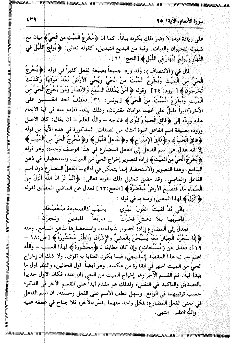 فعدل إلى المضارع إرادة لتصوير شجاعته، واستحضارها لذهن السامع. ومنه إِنَّا سَخَّرْنَا الْجِبالَ مَعَهُ يُسَبِّحْنَ بِالْعَشِيِّ وَالْإِشْراقِ وَالطَّيْرَ مَحْشُورَةً [ص: 18- 19] ، فعدل عن (مسبّحات) وإن كان مطابقا ل مَحْشُورَةً لهذا السبب- والله أعلم-. ثم هذا المقصد إنما يجيء فيما يكون العناية به أقوى. ولا شك أن إخراج الحيّ من الميت أشهر في القدرة من عكسه. وهو أيضا أول الحالين، والنظر أول ما يبدأ فيه. ثم القسم الآخر وهو إخراج الميت من الحي بان عنه، فكان الأول جديرا بالتصديق والتأكيد في النفس، ولذلك هو مقدم أبدا على القسم الآخر في الذكر حسب ترتيبهما في الواقع. وسهل عطف الاسم على الفعل وحسّنه. أن اسم الفاعل في معنى الفعل المضارع، فكل واحد منهما يقدّر بالآخر، فلا جناح في عطفه عليه- والله أعلم- انتهى.