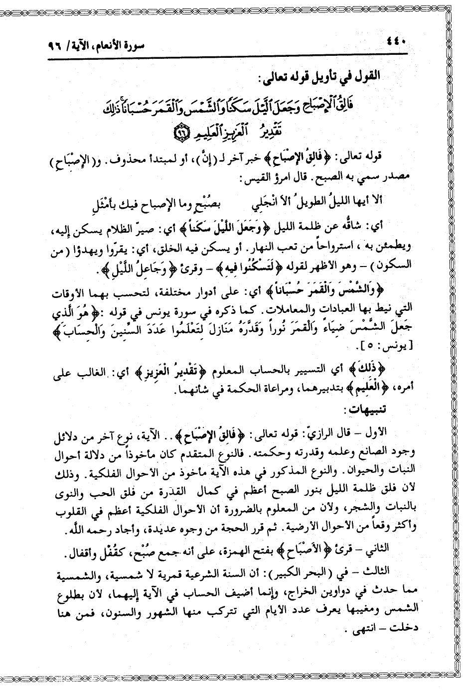 الأول- قال الرازيّ: قوله تعالى: فالِقُ الْإِصْباحِ.. الآية، نوع آخر من دلائل وجود الصانع وعلمه وقدرته وحكمته. فالنوع المتقدم كان مأخوذا من دلالة أحوال النبات والحيوان. والنوع المذكور في هذه الآية مأخوذ من الأحوال الفلكية. وذلك لأن فلق ظلمة الليل بنور الصبح أعظم في كمال القدرة من فلق الحب والنوى بالنبات والشجر، ولأن من المعلوم بالضرورة أن الأحوال الفلكية أعظم في القلوب وأكثر وقعا من الأحوال الأرضية. ثم قرر الحجة من وجوه عديدة، وأجاد رحمه الله.