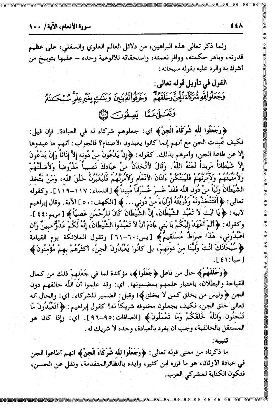 وَجَعَلُوا لِلَّهِ شُرَكاءَ الْجِنَّ وَخَلَقَهُمْ وَخَرَقُوا لَهُ بَنِينَ وَبَناتٍ بِغَيْرِ عِلْمٍ سُبْحانَهُ وَتَعالى عَمَّا يَصِفُونَ (100)
