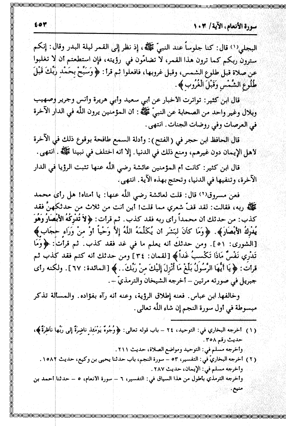 قال ابن كثير: تواترت الأخبار عن أبي سعيد وأبي هريرة وأنس وجرير وصهيب وبلال وغير واحد من الصحابة عن النبيّ صلى الله عليه وسلم: أن المؤمنين يرون الله في الدار الآخرة في العرصات وفي روضات الجنات