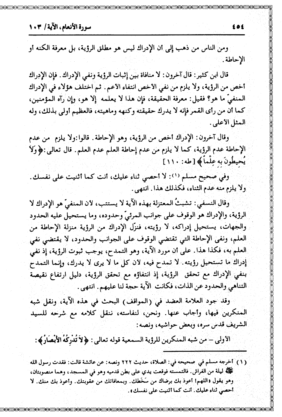 وقال النسفي: تشبث المعتزلة بهذه الآية لا يستتب، لأن المنفيّ هو الإدراك لا الرؤية، والإدراك هو الوقوف على جوانب المرئيّ وحدوده، وما يستحيل عليه الحدود والجهات، يستحيل إدراكه، لا رؤيته، فنزّل الإدراك من الرؤية منزلة الإحاطة من العلم، ونفى الإحاطة التي تقتضي الوقوف على الجوانب والحدود، لا يقتضي نفي العلم به، فكذا هذا. على أن مورد الآية، وهو التمدح، يوجب ثبوت الرؤية، إذ نفي إدراك ما تستحيل رؤيته. لا تمدح فيه، لأن كل ما لا يرى لا يدرك، وإنما التمدح بنفي الإدراك مع تحقق الرؤية، إذ انتفاؤه مع تحقق الرؤية، دليل ارتفاع نقيصة التناهي والحدود عن الذات، فكانت الآية حجة لنا عليهم. انتهى.