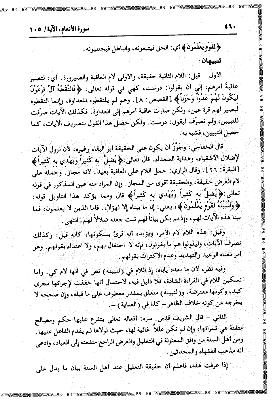 قال الخفاجي: وجوّز أن يكون على الحقيقة أبو البقاء وغيره، لأن نزول الآيات لإضلال الأشقياء، وهداية السعداء. قال تعالى: يُضِلُّ بِهِ كَثِيراً وَيَهْدِي بِهِ كَثِيراً [البقرة: 26] . وقال الرازي: حمل اللام على العاقبة بعيد. لأنه مجاز. وحمله على لام الغرض حقيقة، والحقيقة أقوى من المجاز. وإن المراد منه عين المذكور في قوله تعالى: يُضِلُّ بِهِ كَثِيراً وَيَهْدِي بِهِ كَثِيراً قال ومما يؤكد هذا التأويل قوله: