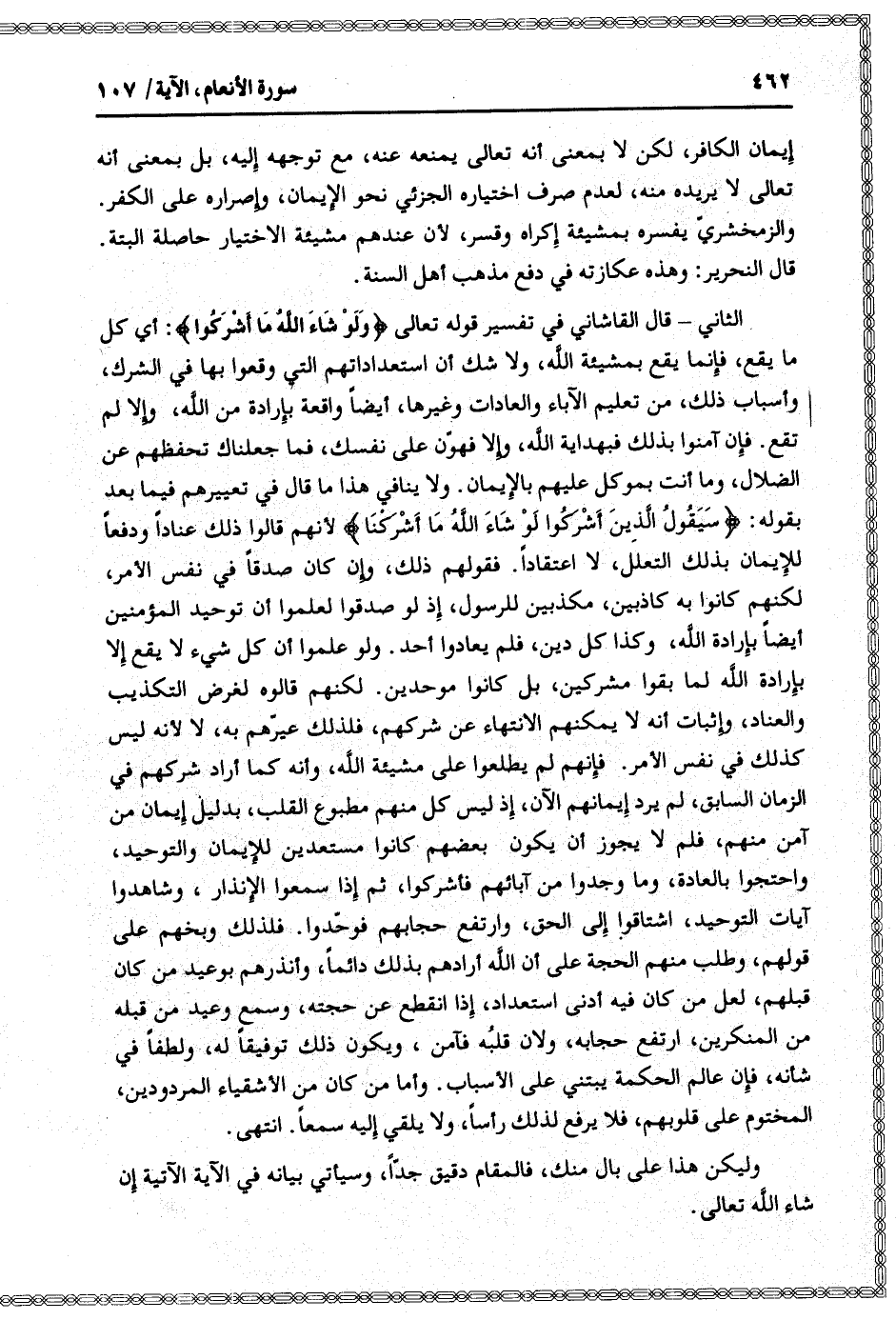 الثاني- قال القاشاني في تفسير قوله تعالى وَلَوْ شاءَ اللَّهُ ما أَشْرَكُوا: أي كل ما يقع، فإنما يقع بمشيئة الله، ولا شك أن استعداداتهم التي وقعوا بها في الشرك، وأسباب ذلك، من تعليم الآباء والعادات وغيرها، أيضا واقعة بإرادة من الله، وإلا لم تقع. فإن آمنوا بذلك فبهداية الله، وإلا فهوّن على نفسك، فما جعلناك تحفظهم عن الضلال، وما أنت بموكل عليهم بالإيمان. ولا ينافي هذا ما قال في تعييرهم فيما بعد بقوله: سَيَقُولُ الَّذِينَ أَشْرَكُوا لَوْ شاءَ اللَّهُ ما أَشْرَكْنا لأنهم قالوا ذلك عنادا ودفعا للإيمان بذلك التعلل، لا اعتقادا. فقولهم ذلك، وإن كان صدقا في نفس الأمر، لكنهم كانوا به كاذبين، مكذبين للرسول، إذ لو صدقوا لعلموا أن توحيد المؤمنين أيضا بإرادة الله، وكذا كل دين، فلم يعادوا أحد. ولو علموا أن كل شيء لا يقع إلا بإرادة الله لما بقوا مشركين، بل كانوا موحدين. لكنهم قالوه لغرض التكذيب والعناد، وإثبات أنه لا يمكنهم الانتهاء عن شركهم، فلذلك عيّرهم به، لا لأنه ليس كذلك في نفس الأمر. فإنهم لم يطلعوا على مشيئة الله، وأنه كما أراد شركهم في الزمان السابق، لم يرد إيمانهم الآن، إذ ليس كل منهم مطبوع القلب، بدليل إيمان من آمن منهم، فلم لا يجوز أن يكون بعضهم كانوا مستعدين للإيمان والتوحيد، واحتجوا بالعادة، وما وجدوا من آبائهم فأشركوا، ثم إذا سمعوا الإنذار، وشاهدوا آيات التوحيد، اشتاقوا إلى الحق، وارتفع حجابهم فوحّدوا. فلذلك وبخهم على قولهم، وطلب منهم الحجة على أن الله أرادهم بذلك دائما، وأنذرهم بوعيد من كان قبلهم، لعل من كان فيه أدنى استعداد، إذا انقطع عن حجته، وسمع وعيد من قبله من المنكرين، ارتفع حجابه، ولان قلبه فآمن، ويكون ذلك توفيقا له، ولطفا في شأنه، فإن عالم الحكمة يبتني على الأسباب. وأما من كان من الأشقياء المردودين، المختوم على قلوبهم، فلا يرفع لذلك رأسا، ولا يلقي إليه سمعا. انتهى.